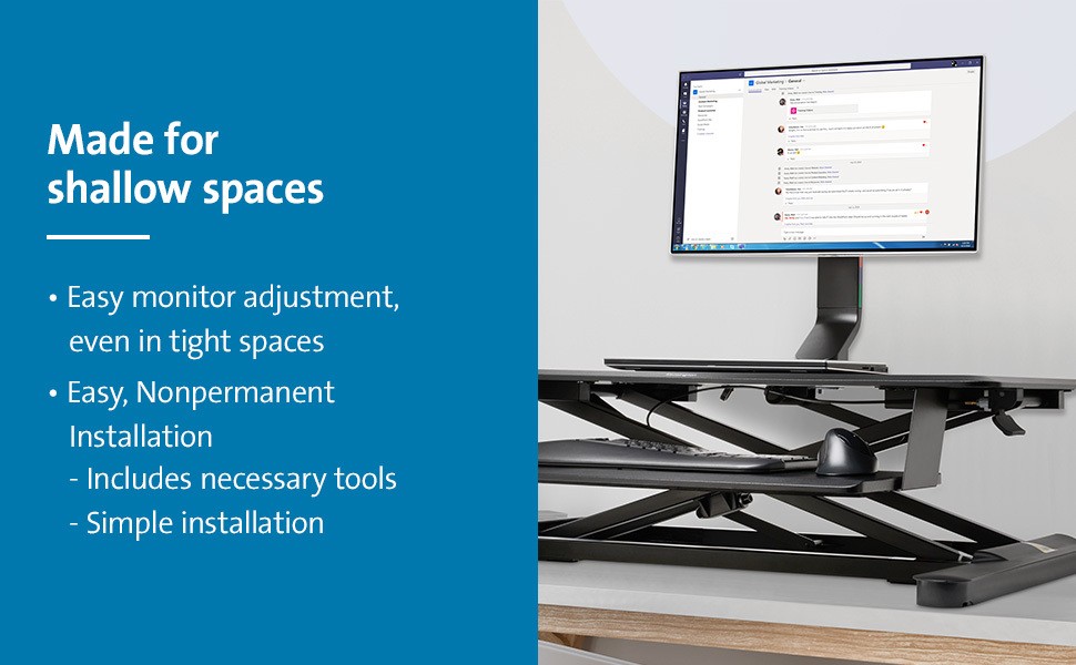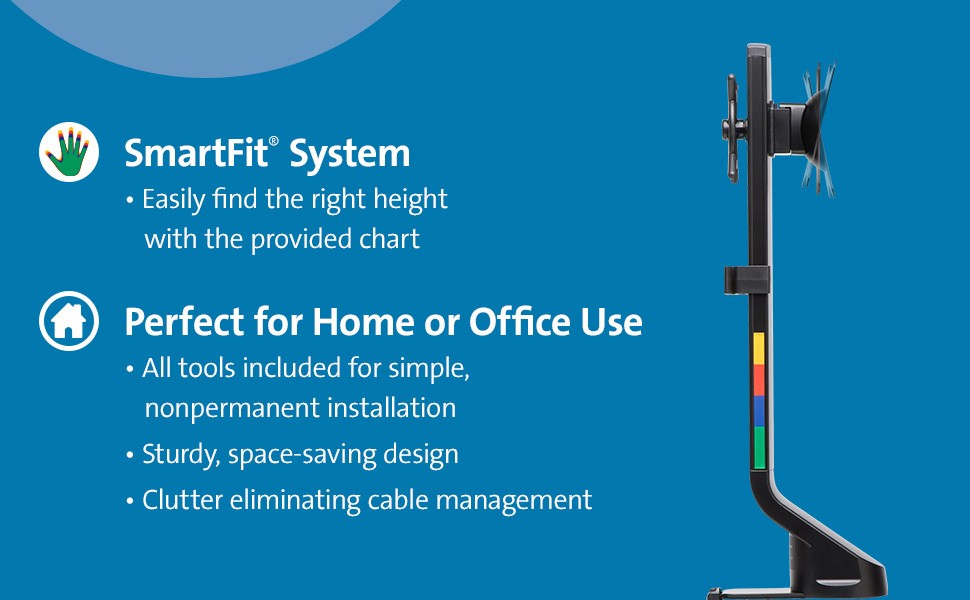 Finding the correct ergonomic monitor adjustment is easy — even for desks with a shallow depth — with the SmartFit® Space-Saving Single Monitor Arm. Easy, nonpermanent installation includes necessary tools and a preinstalled C-clamp that faces the front of the desk, making installation much simpler, especially in tight spaces (optional grommet mount included). An easy-grip adjustment knob allows you to quickly and easily adjust height (9.4”-18.5”), tilt and swivel (+/- 10°), rotate to landscape or portrait orientation (+/-180°), and lock your monitor in place. Sleek, sturdy, stable, space-saving, and non-marking design is perfect for home or office use. C-clamp fits desks up to 3.3 inches (85mm) thick. Grommet mount fits desks up to 1.5 inches (40mm) thick. Compatible with sit/stand desks. Supports monitors up to 32” and up to 17.6 lbs. (8 kg), and complements a modern aesthetic. Includes cable management and a quickrelease VESA mount.