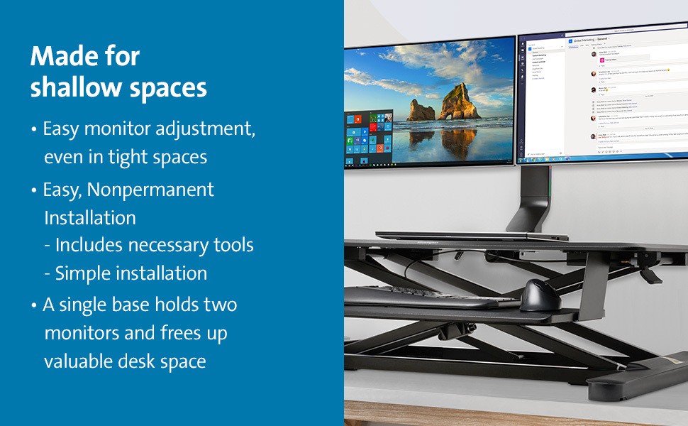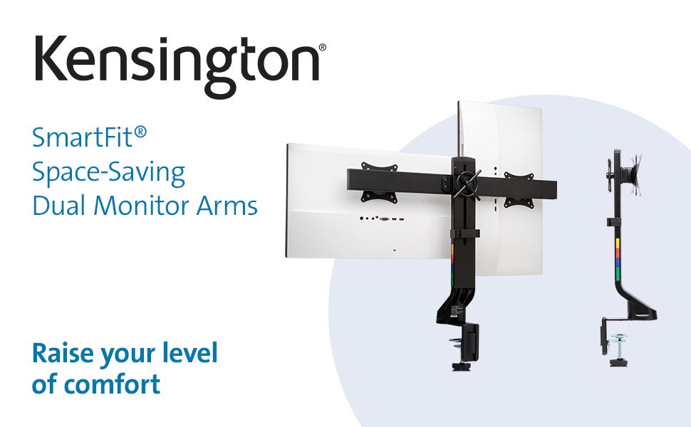 Supports monitors up to 27” and up to 17.6 lbs. (8 kg), and complements a modern aesthetic. Includes cable management and quickrelease VESA mounts.