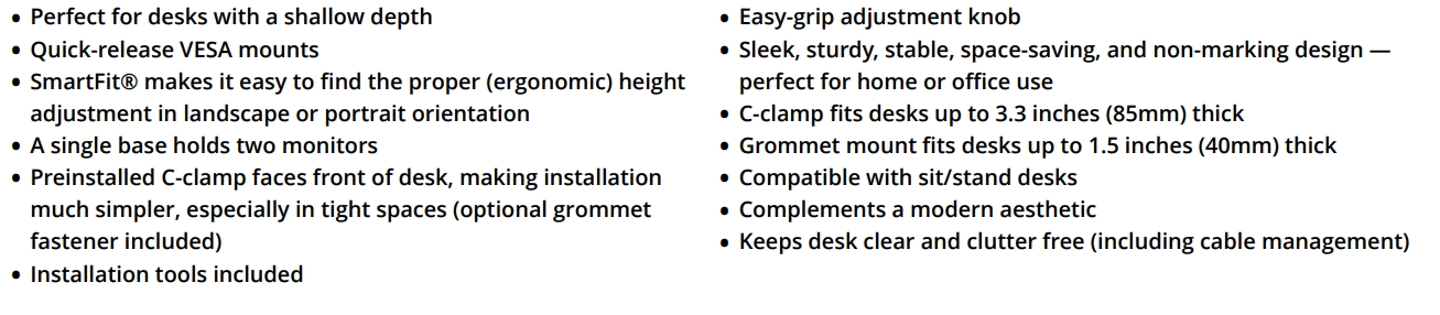Finding the correct ergonomic monitor adjustment is easy — even for desks with a shallow depth — with the SmartFit® Space-Saving Dual Monitor Arm. Easy, nonpermanent installation includes necessary tools and a preinstalled C-clamp that faces the front of the desk, making installation much simpler, especially in tight spaces (optional grommet mount included). An easy-grip adjustment knob allows you to quickly and easily adjust height (9.4”-18.5”), tilt and swivel (+/- 10°), rotate to landscape or portrait orientation (+/-180°), and lock your monitors in place. Sleek, sturdy, stable, space-saving, and non-marking design is perfect for home or office use. C-clamp fits desks up to 3.3 inches (85mm) thick. Grommet mount fits desks up to 1.5 inches (40mm) thick. Compatible with sit/stand desks.