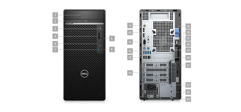 1. Power Button | 2. Optional DVD-RW | 3. 2 USB 2.0 Ports (1 with PowerShare) | 4. USB 3.2 Gen 2 Type-A Port | 5. Optional SD Slot | 6. Universal Audio Jack | 7. USB 3.2 Gen 2 Type-C Port | 8. Audio Line out / Line in | 9. DisplayPort 1.4 | 10. DisplayPort 1.4 | 11. Serial Port | 12. 1 USB 3.2 Gen 2 Type-A Port and 3 USB 3.2 Gen 1 Type-A Ports | 13. USB 2.0 Ports with Power On | 14. Optional Expansion Card Slots | 15. Side Panel Release Latch | 16. Optional: VGA Port/DisplayPort 1.4 Port/HDMI 2.0 Port/ USB 3.2 Gen 2 Type-C Port with DisplayPort Alt-mode | 17. PS/2 Keyboard | 18. PS/2 Mouse | 19. Kensington lock slot | 20. RJ-45 | 21. Optional Antenna | 22. Power Connection | 23. Padlock Loop | 24. Power Diagnostics Light