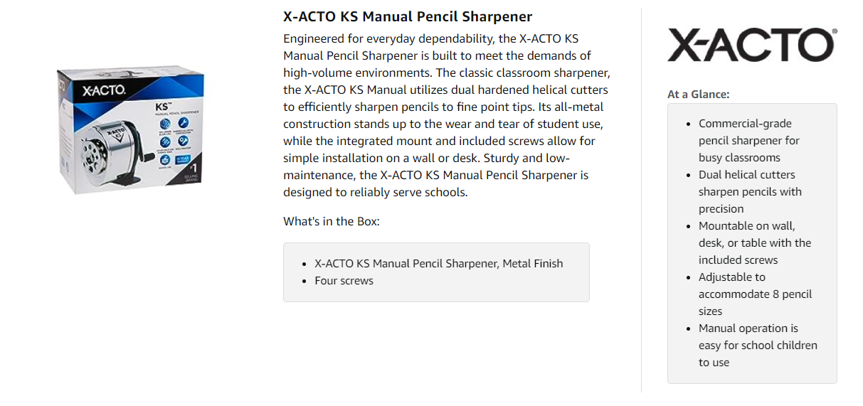 The X-ACTO KS Manual Pencil Sharpener is designed specifically to stand up to regular and continuous use in high-traffic classroom environments. A die-cast metal base provides rugged stability, while a nickel-plated shavings receptacle withstands years of use.