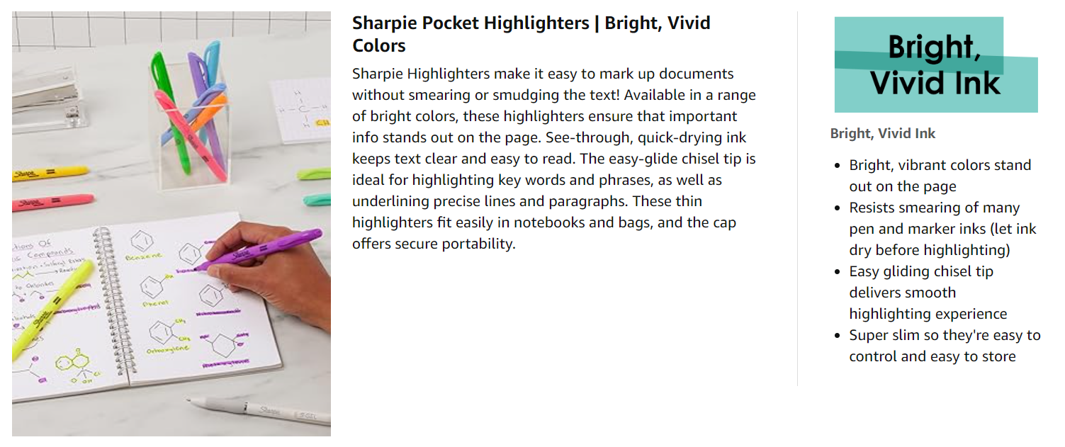 Vivid ColorsSharpie Highlighters come in a range of colors, including this pack of bright, vivid colors that stand out on the page and let you spot important information quickly. |
