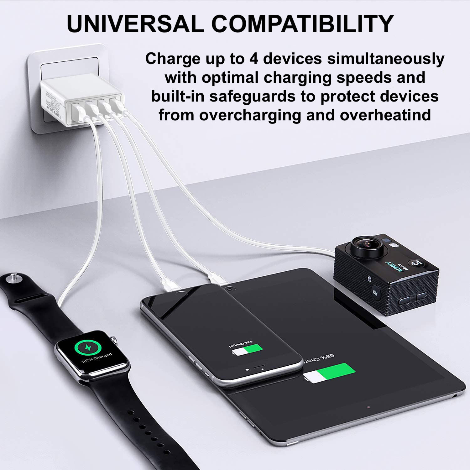 The port is able to automatically detect whichever device you have connected to adjust the voltage to give you the fastest charge. The QC port and its compact, lightweight design make this Adapter the ideal travelling charger. Any USB-charged device is compatible: Android smartphone, iPhone, and iPad to name a few. Travel charged or quickly get back to 100 percent with this 4-port USB charger.