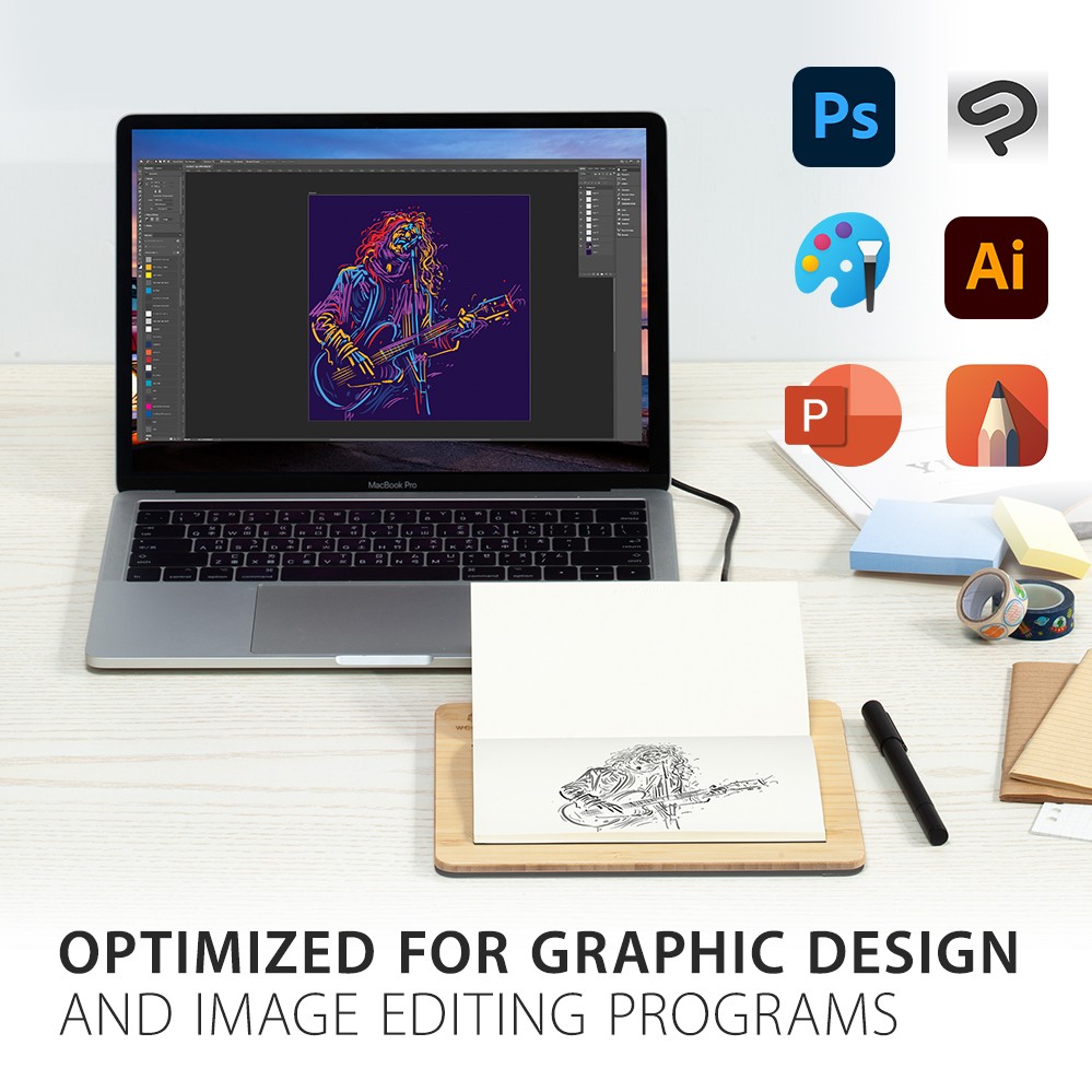 This device is compatible PowerPoint, Autodesk SketchBook, Paint, InDesign, Photoshop, Clip Studio and more.