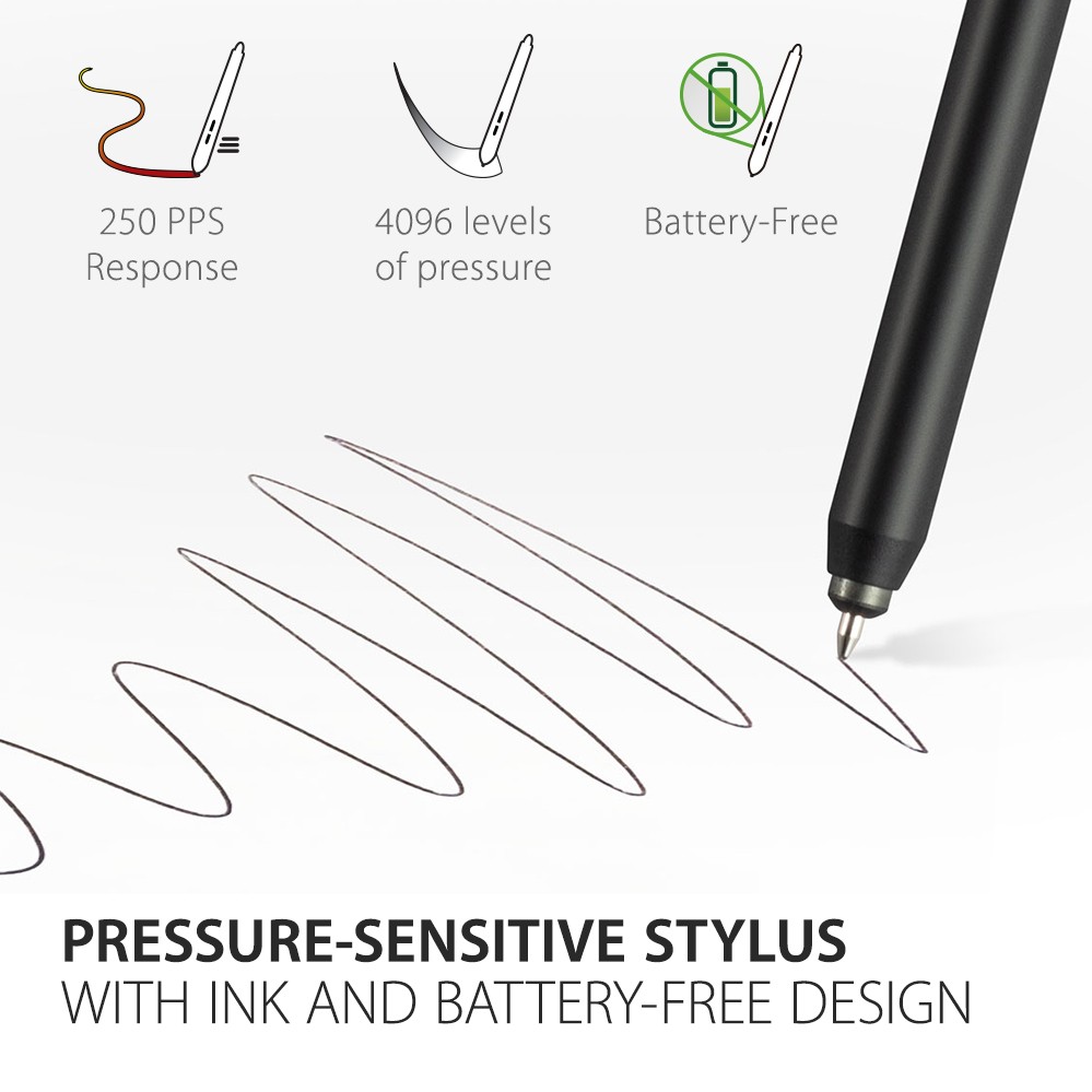 An interactive stylus pen delivers up to 4,096 levels of pressure sensitivity and 250 pps response rate for an incredibly responsive and natural handwriting experience.