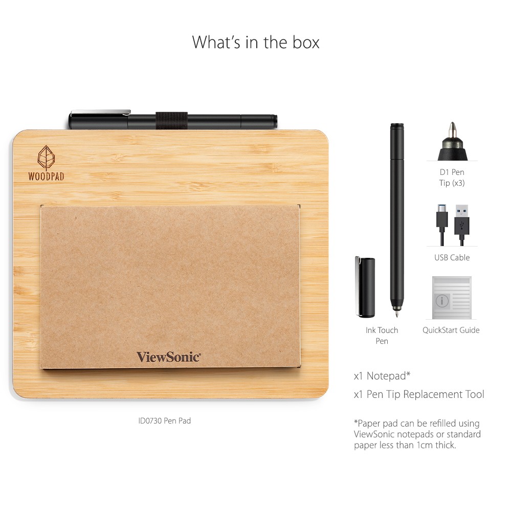 The ViewSonic ® ID0730 ViewBoard Notepad is part of ViewSonic’s full line of interactive devices designed for a variety of education scenarios including hybrid teaching at home or in the classroom. The ID0730 ViewBoard Notepad is a 7.5” interactive writing pad that allows you to write and draw on real paper, while simultaneously digitizing all of your pen strokes. A patented electromagnetic battery-free pen delivers up to 4,096 levels of pressure sensitivity for an accurate and realistic writing experience. The pen and pad combination allows teachers to write on real paper, while providing the ability to digitally save and share these annotations online. Single-cable connectivity allows users to quickly plug the device in and immediately start interacting with the screen with no driver installation needed. What’s more, its lightweight and compact design makes it perfect for easy carrying from classroom to home for hybrid teaching and distance learning.