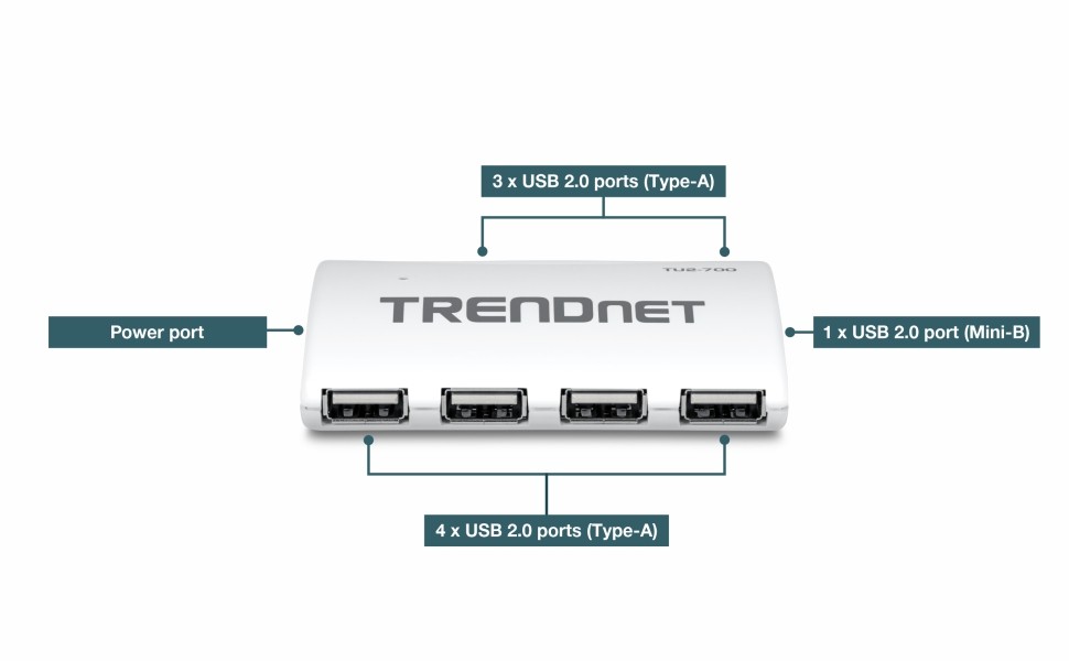 TRENDnet’s 7-Port USB 2.0 Hub, model TU2-700, instantly adds seven 480Mbps USB 2.0 ports to a computer. Easy installation –