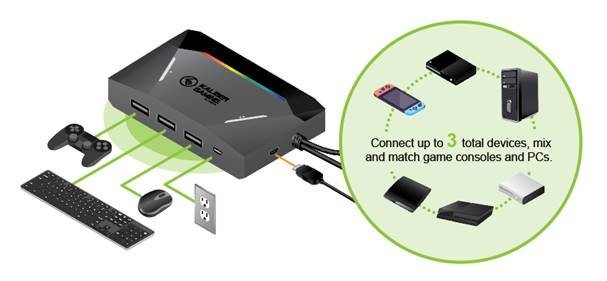 The KeyMander® 2 3Play™ from Kaliber Gaming by IOGEAR is a keyboard/mouse sharing switch for PC and game consoles, that allows gamers to share their keyboard and mouse between any (3) three of the following devices, PC, Xbox One, Xbox 360, PS3®, PS4®, or Nintendo® Switch. Use your keyboard and mouse skills to dominate all your favorite First-Person Shooter (FPS), Role Playing Games (RPG) and Real-Time Strategy (RTS) games. Playing on a console has never been this much fun!