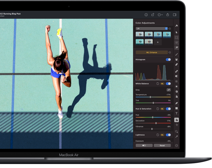 Up to 9x faster. Even for a 16‑core Neural Engine, that’s a lot to process. Apps on MacBook Air can use machine learning (ML) to automatically retouch photos like a pro, make smart tools such as magic wands and audio filters more accurate at auto‑detection, and so much more. That’s not just brain power — that’s the power of a full stack of ML technologies.