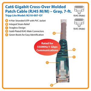 Manufactured from 4-pair stranded UTP, the N210-007-GY provides high-speed connection and flawless signal delivery while keeping near-end crosstalk levels to a minimum. This cable can deliver speeds up to 550MHz/1 Gbps. Featuring a PVC jacket, this seven-foot Tripp Lite Cat6 Gigabit Molded Cross-Over Patch Cable is constructed of top-quality materials for long life and durability. Its RJ45 (male) connectors are gold-plated to ensure accurate signal transfer. For a secure connection, the N210-007-GY has molded integral strain-relief and a snagless design that protects the locking tabs on the RJ45 (male) connectors from being damaged or snapped off during installation. This cable’s boots are green to help distinguish it from a standard patch cable. It meets the most current industry standards, including IEEE 802.3ab, IEEE 802.5, ANSI/EIA/TIA 568, ISO/IEC 11801 and ETL (category 6 draft 11).