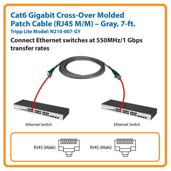Don’t settle for less than the best—enjoy better signal quality and faster transmission! This seven-foot Tripp Lite Cat6 Gigabit Molded Cross-Over Patch Cable ensures ultra-fast performance when connecting two Ethernet switches. The N210-007-GY is manufactured to exacting specifications, using superior materials, for optimal network performance. It’s designed for 1000Base-T (1 Gbps Ethernet) and 10/100Base-T (Ethernet) applications. For peace of mind, the N210-007-GY comes backed by a lifetime warranty and has an eco-friendly, RoHS-compliant design.