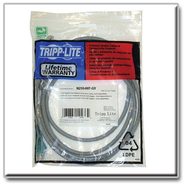 For peace of mind, this seven-foot Tripp Lite Cat6 Gigabit Molded Cross-Over Patch Cable comes backed by a lifetime warranty. The N210-007-GY is manufactured in compliance with strict RoHS specifications, reflecting Tripp Lite’s commitment to environmental responsibility.