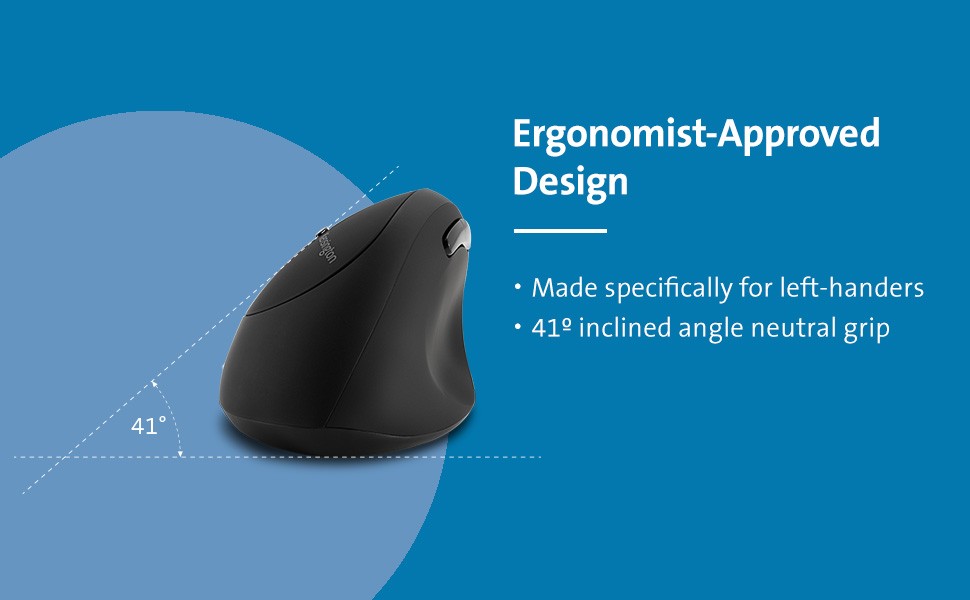 Made especially for left-handers, the ergonomist-approved Pro Fit Left-Handed Ergo Wireless Mouse is the right mouse for your left hand. Features include a 41º neutral “handshake” grip that positions the hand for improved comfort; plug-and-play USB connectivity; six-button control, including forward and back, enhance navigation and productivity; triple DPI settings (800, 1,200, 1,600) let you dial in the sensitivity and precision of your mouse cursor; 128-bit AES encryption; KensingtonWorks customization; and cross-platform compatibility (Windows, macOS, Chrome OS).