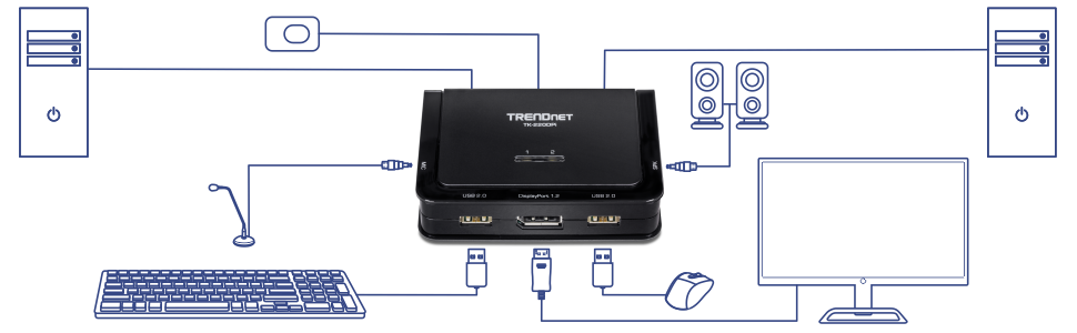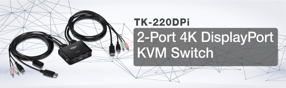 TRENDnet’s 2-Port 4K DisplayPort KVM Switch, model TK-220DPi, allows you to control two computers with one set of console controls. Easily experience up to 4K UHD resolutions, no driver installation required. This compact DisplayPort switch is designed for 4K DisplayPort systems with USB mouse and keyboard connections. This UHD DisplayPort KVM switch also features 3.5mm speaker and microphone connections to switch between computers.