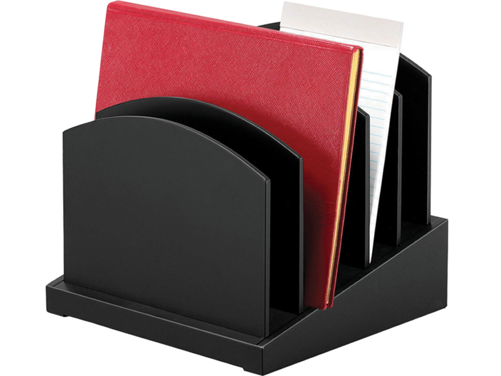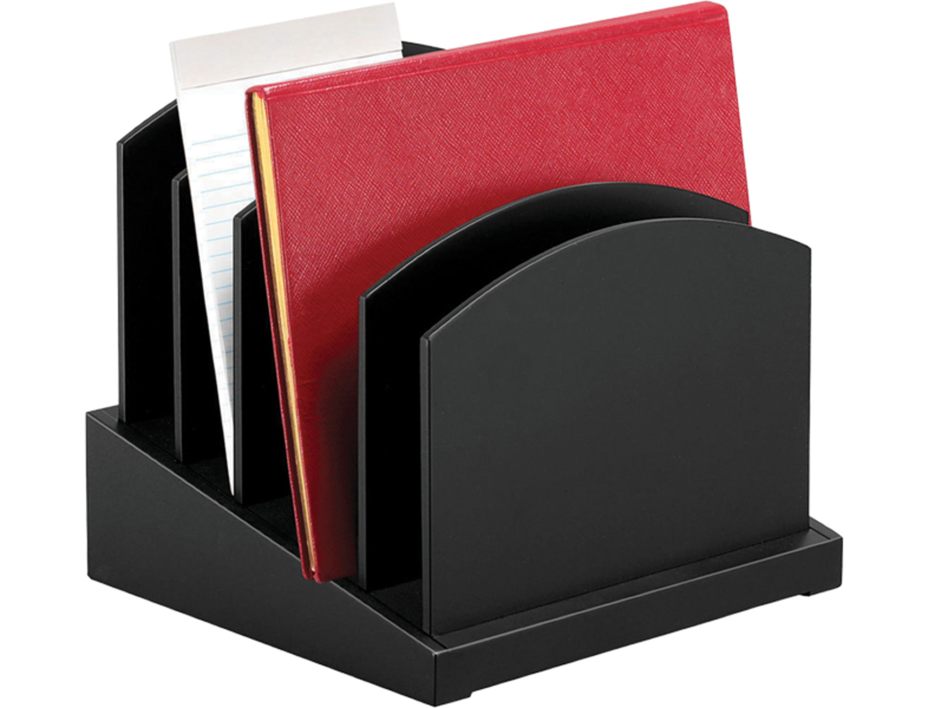 The Victor Midnight Black Collection™ brings a fresh perspective to desk accessories by offering functional solutions with appealing design elements. The 8601-5 Incline File provides five full-sized file slots to hold files, letters, notebooks, and papers. Removable dividers allow you to adjust the slot sizes. Features sturdy 4.6 lb. wood construction with a durable double coated matte black finish. Non-slip rubber feet reduce movement and protect your work surface from scratches and scuffs.