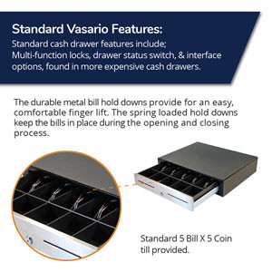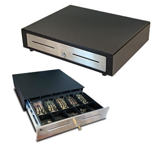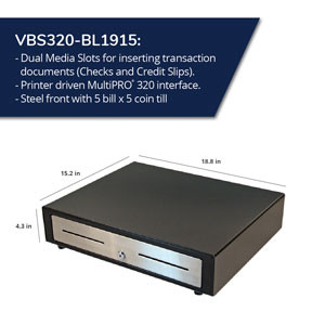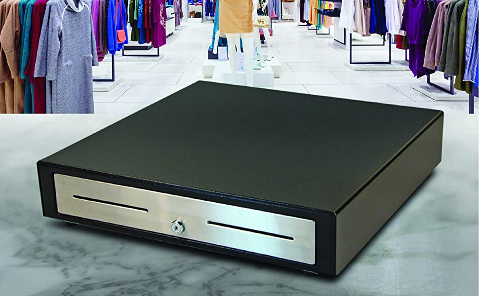 The black with stainless steel front drawer comes with a plastic till that has five bill compartments and five coin compartments for organizing money. Finished with two media slots for inserting checks, credit card receipts, or other transaction papers.