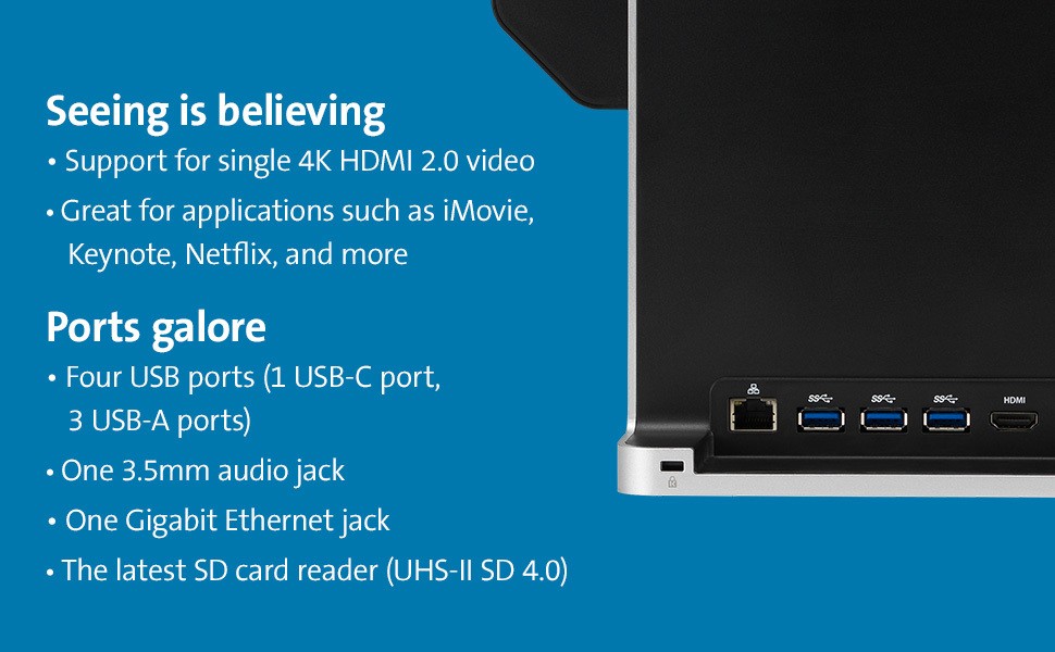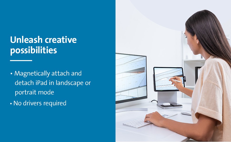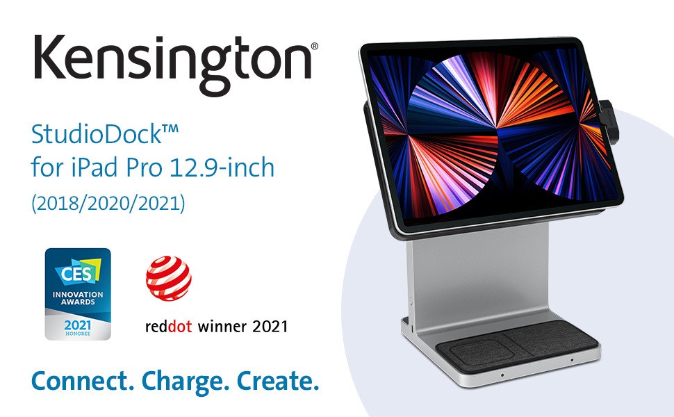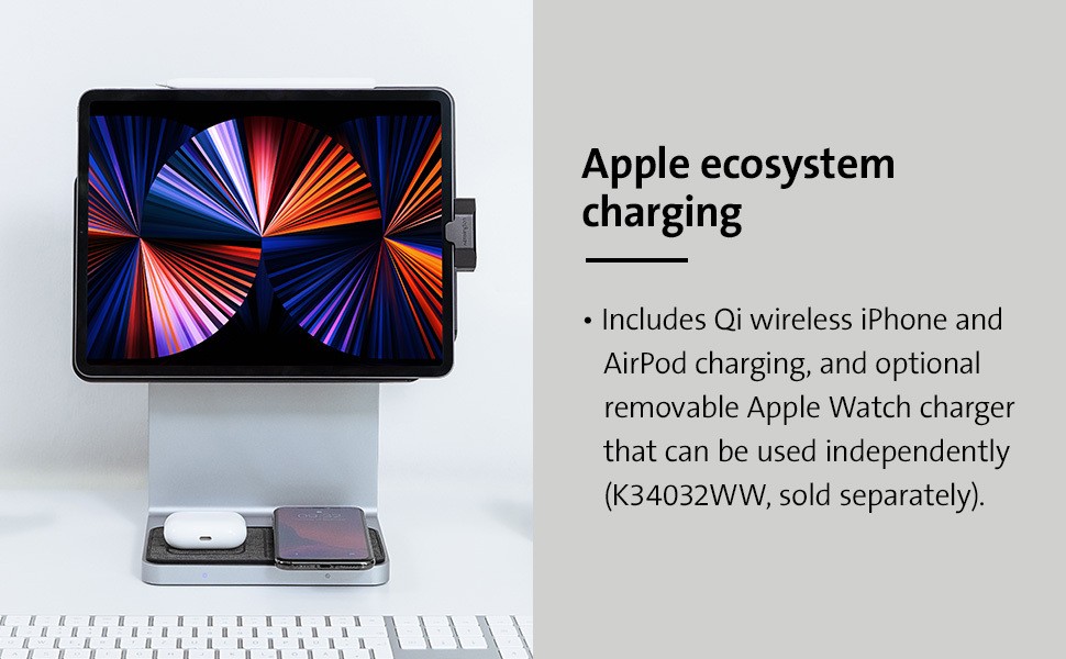 Get the most from your iPad Pro with StudioDock. The ideal iPad Pro docking station that expands more than your desktop options — it expands your creativity. Magnetically attach and detach your USB-C iPad Pro 12.9” (2018/2020) to the elegantly designed StudioDock, and the possibilities are endless. Apple ecosystem charging includes Qi wireless iPhone and AirPod charging, as well as optional charging for Apple Watch (K34032WW, sold separately — coming mid-2021) and the iPad itself. Seamless access to expansion ports, including USB (USB-A and USB-C), HDMI 2.0 video, Gigabit Ethernet, 3.5mm audio, and SD card reader.
