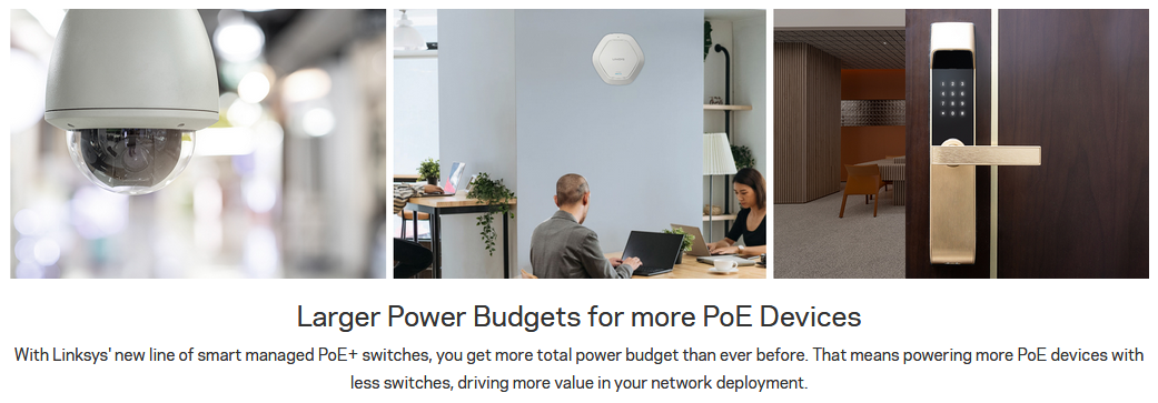Linksys Managed Gigabit PoE+ switches can power PoE+ enabled devices such as surveillance cameras, access points, door access control systems, VoIP phones and ProAV systems. This will eliminate the need for additional power cables and outlets, making installation simpler and less expensive.