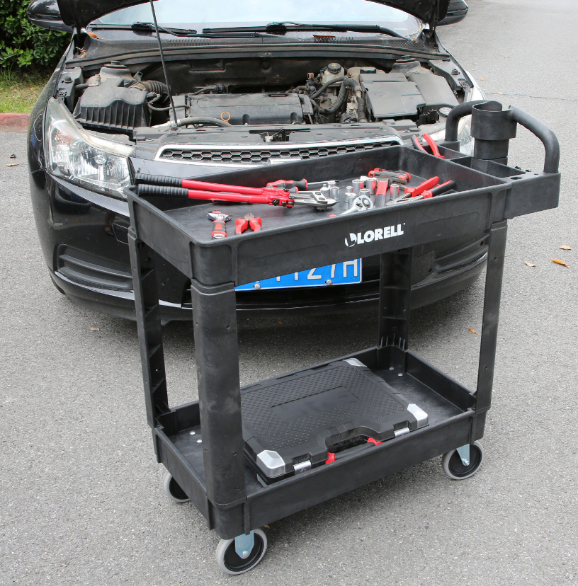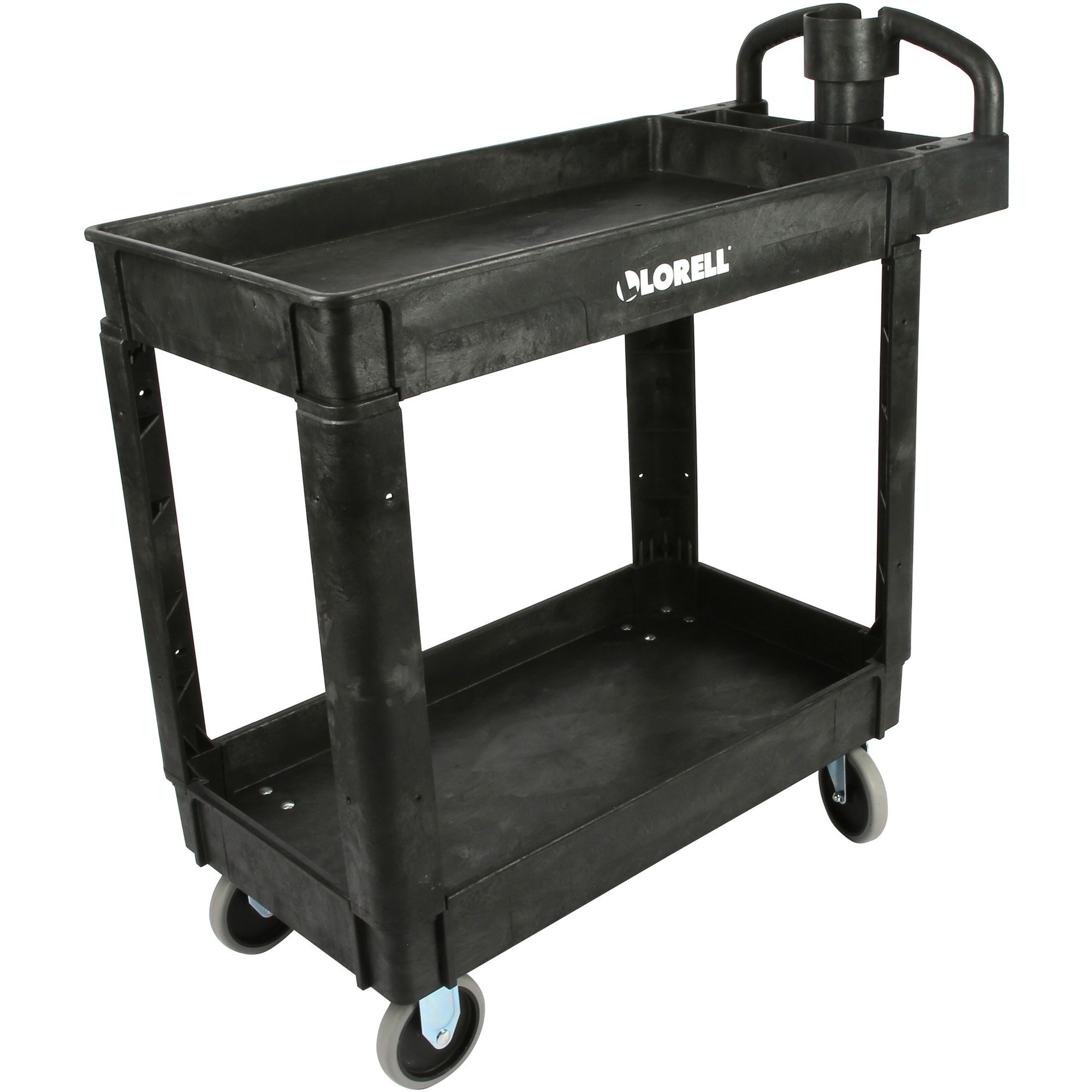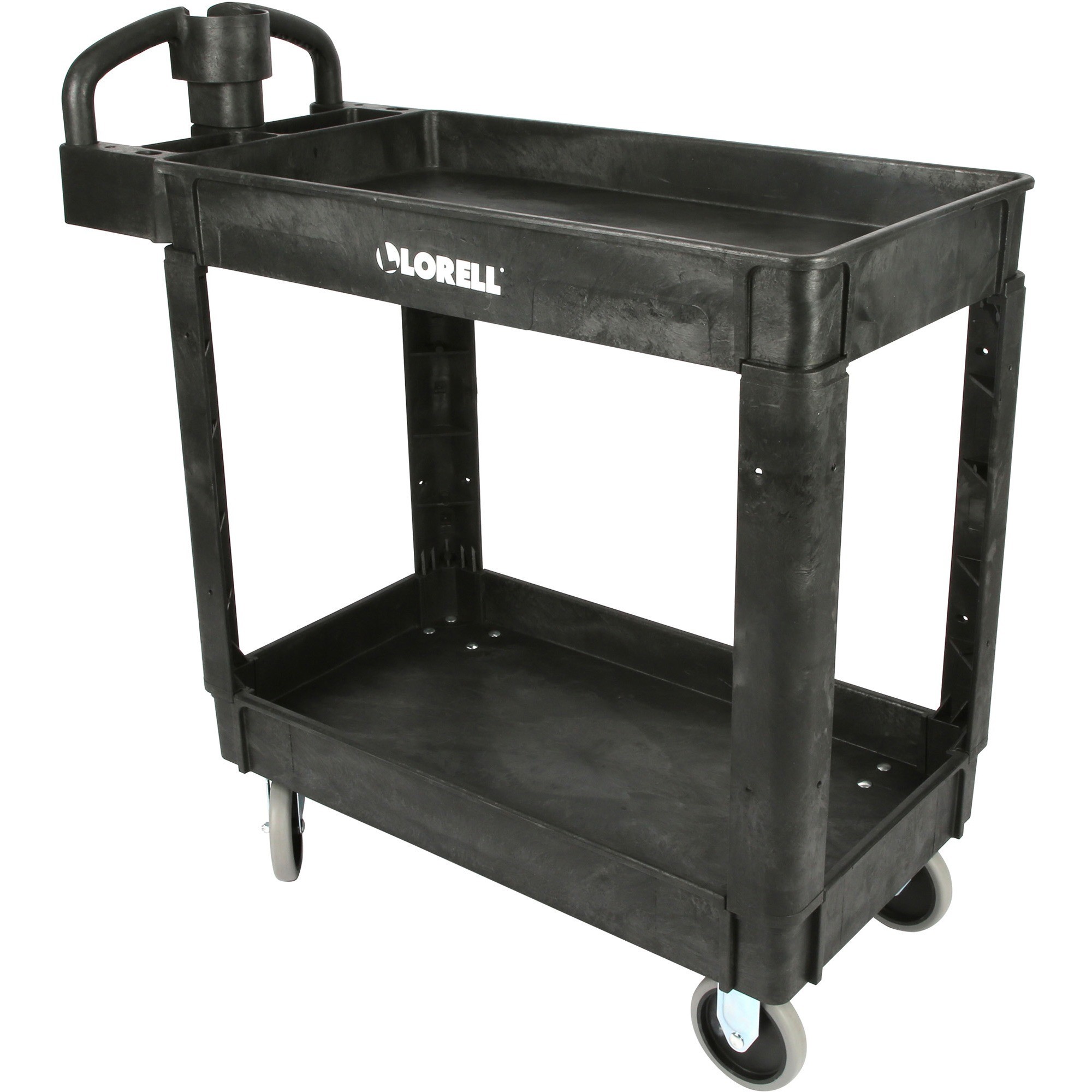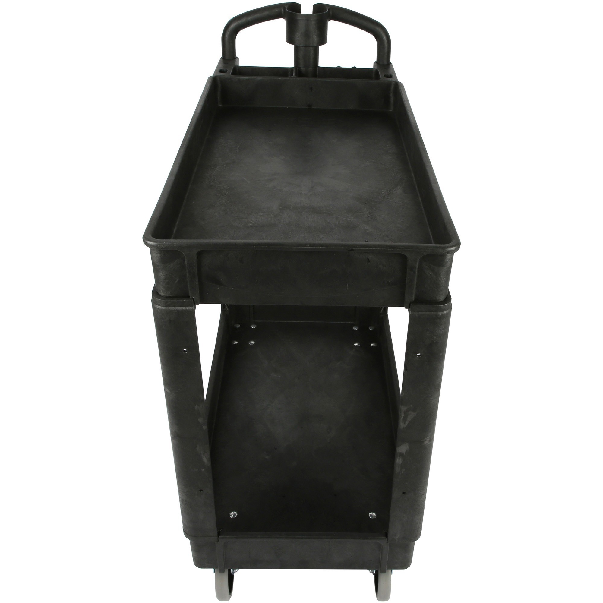 Use this utility cart with a convenient grip-height for transporting equipment, tools and heavy loads in any environment. It is tough enough for material handling and maintenance. Sturdy, structure foam construction won't rust, dent, chip or peel easily. Built-in storage bin in the handle is the perfect way to store small parts. Rounded corners protect walls and furniture. Lightweight, maneuverable cart moves easily on two 5" rigid casters and two 5" swivel casters all in thermoplastic rubber. It holds up to 550 lb. |