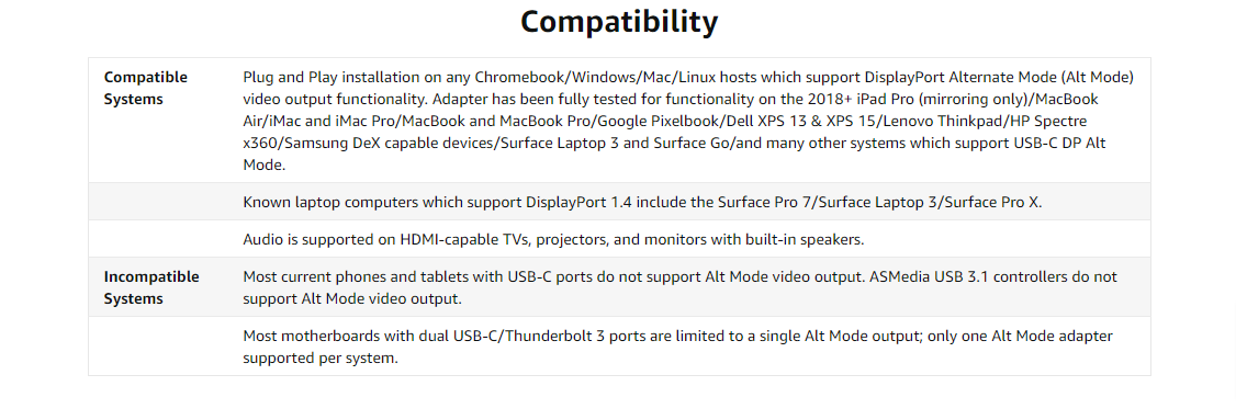 High Definition DisplayYou’ve got too much to do to be cooped up in a little laptop screen. Stretch out with an HDMI-equipped monitor, T.V., or projector and achieve resolutions up to 3840x2160 @ 30Hz (4K 30Hz). For laptops that support DisplayPort 1.4, this hub supports HDMI displays at up to 4K 60Hz. Note: Not all laptops support DisplayPort 1.4. See “Compatible Systems” below for a list of known DP 1.4 hosts. Please consult your laptop manufacturer to help determine if your system is DP 1.4 capable. This hub will not work with DisplayPort monitors. |