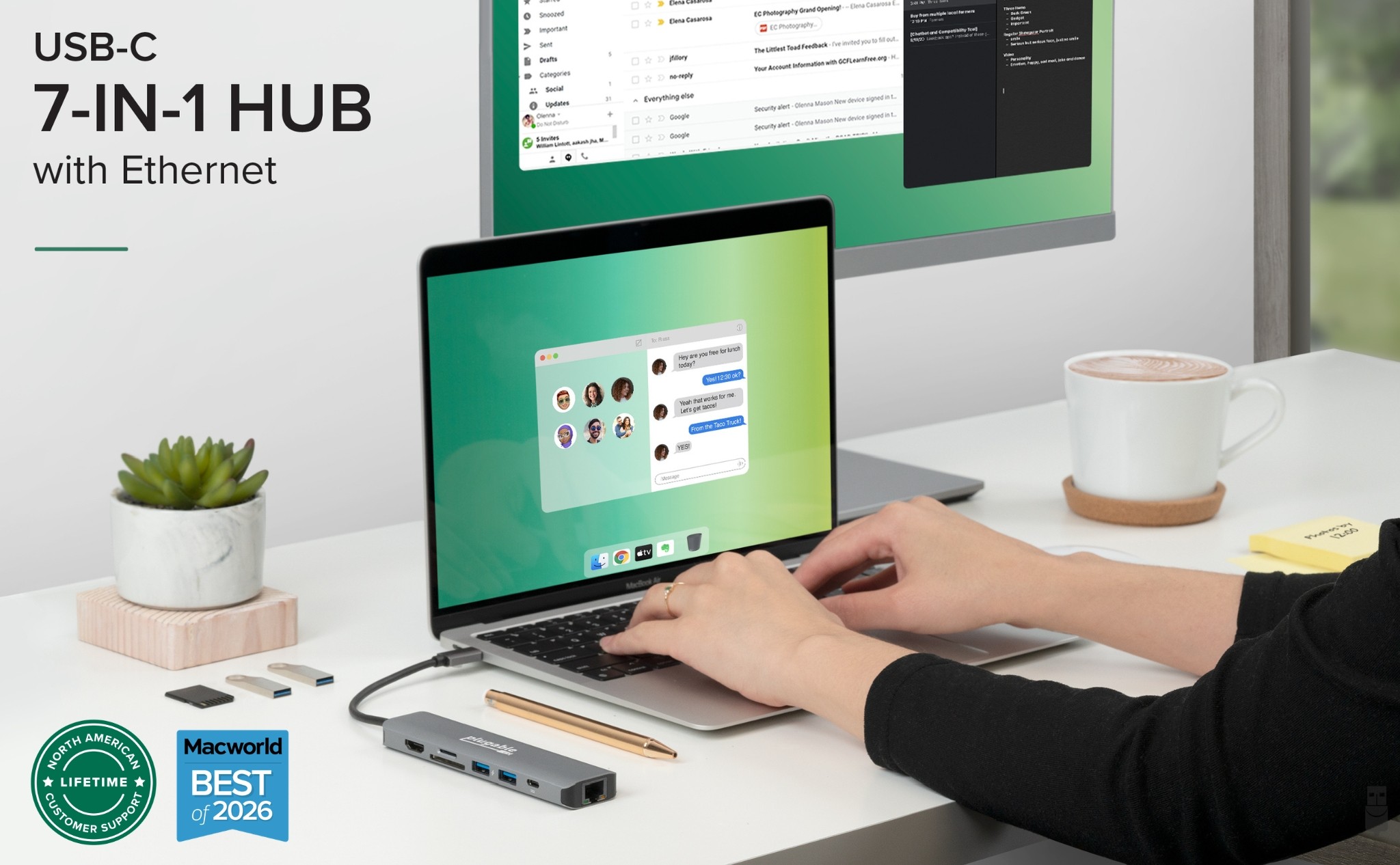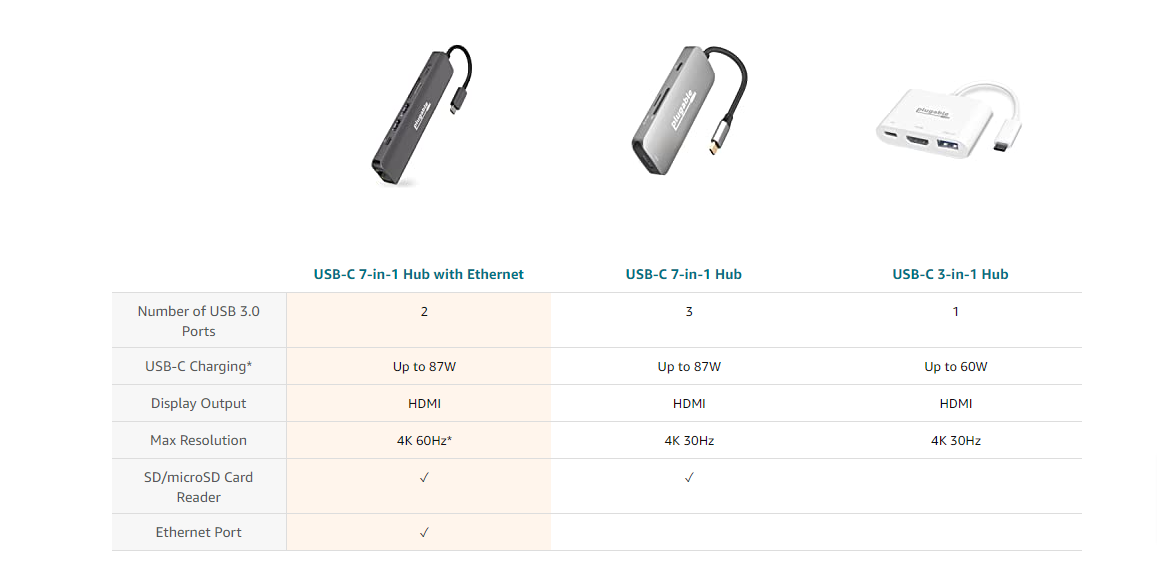 Through a single connection, make space for your preferred peripherals. The Plugable 7-in-1 USB-C Hub (USBC-7IN1E) lets you connect an extra 4K HDMI monitor, two USB devices like a mouse and keyboard, wired Gigabit Ethernet, SD or microSD cards, and 87W charging.