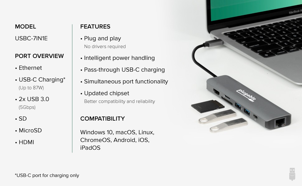 Don’t waste a USB-C port on a charger. The USBC-7IN1E has pass-through charging so you can use all of your peripherals and charge your laptop at the same time, all through one USB-C port.