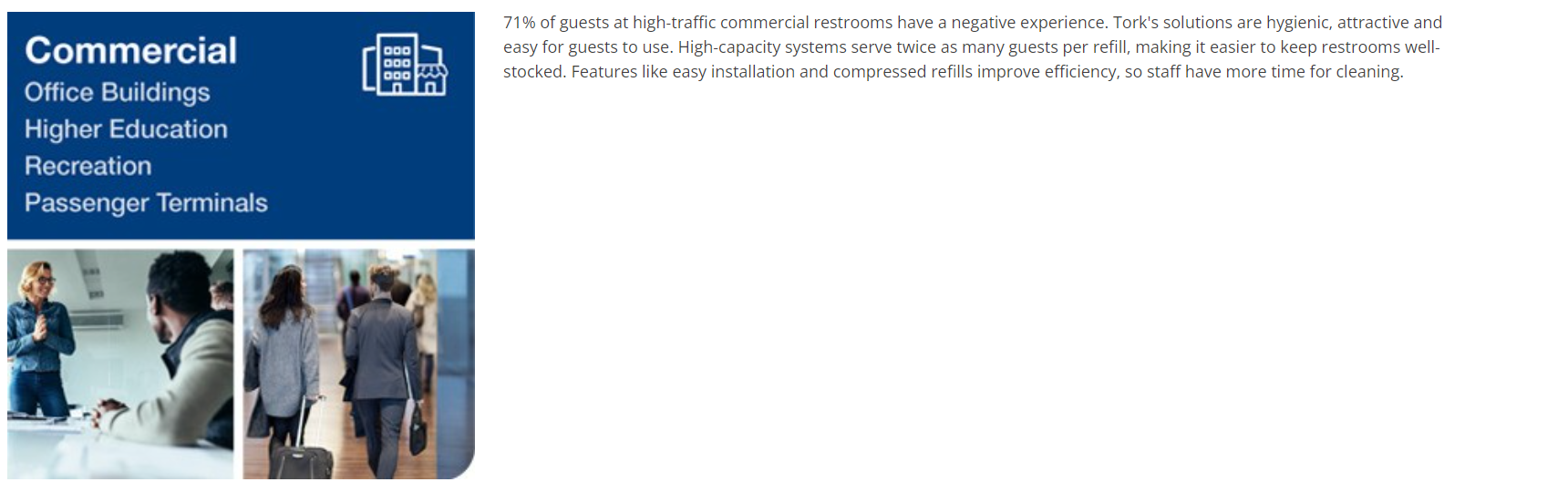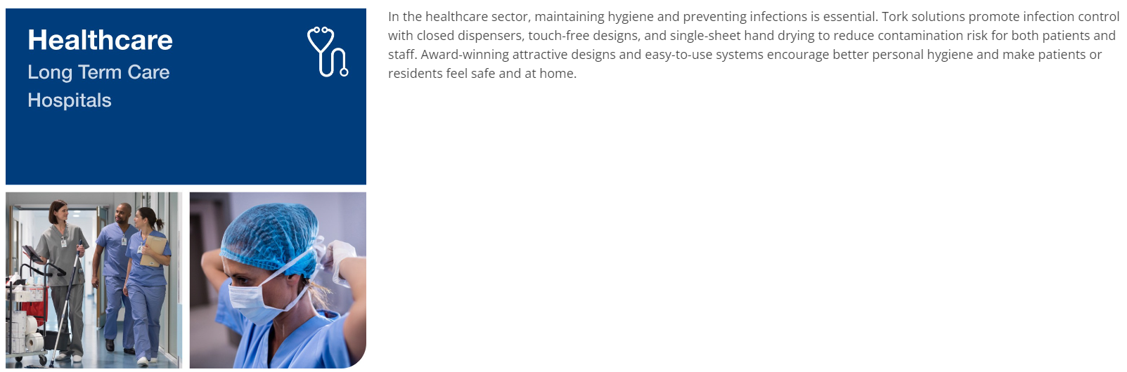 We have products and services that improve the work environment, and we are dedicated to raising hygiene standards for everyone away from home.