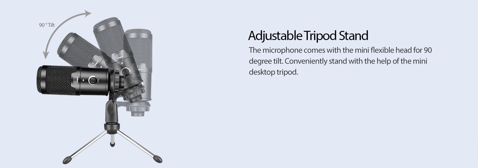 The microphone comes with an adjustable arm for greater than 90-degree tilting to position the microphone for optimal pick-up. The compact, lightweight tripod provides stability with out taking too much desk space.