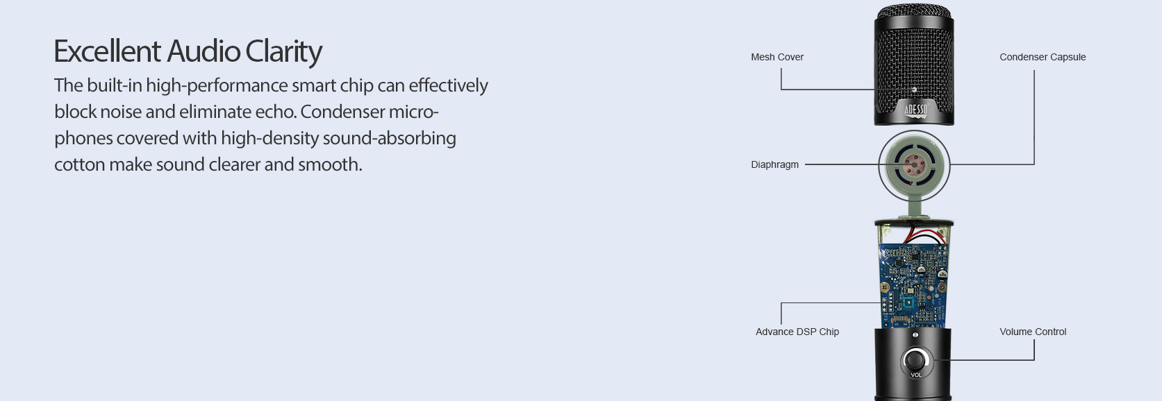 The built-in high-performance smart chip can effectively eliminate background noise and echo. The sensitive condenser microphone provides smooth and clear recordings.