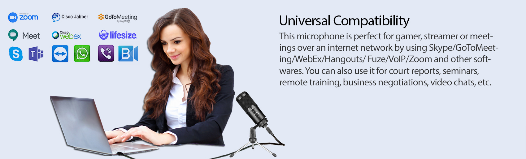 This microphone is perfect for gamers, streamers or meetings. Compatible with most video social media platforms and video conferencing applications such as YouTube, Twitch, Discord, Skype, GoToMeeting, WebEx, Zoom, Google Meet, Microsoft Teams and many more. You can also use it for court reporting, seminars, remote training, and video chats.
