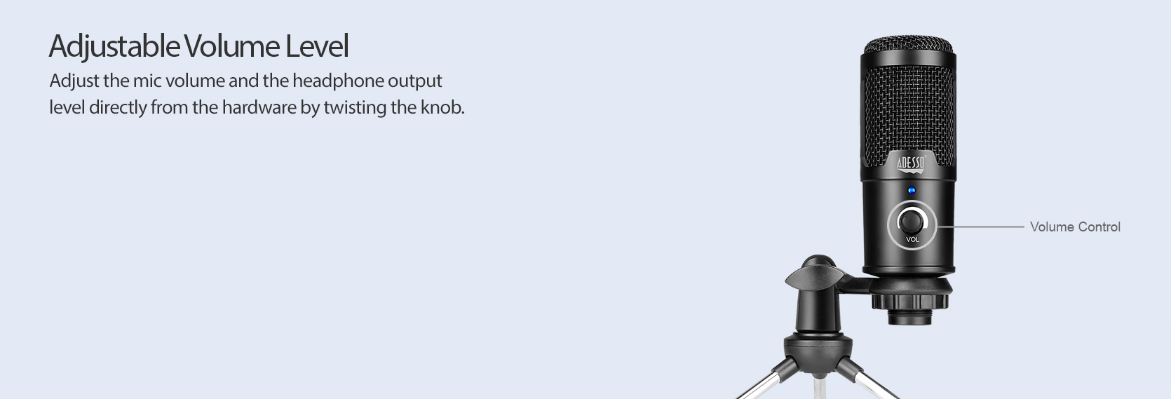 Adjust the mic volume and the headphone output level directly from on the microphone with the conveniently located knob.
