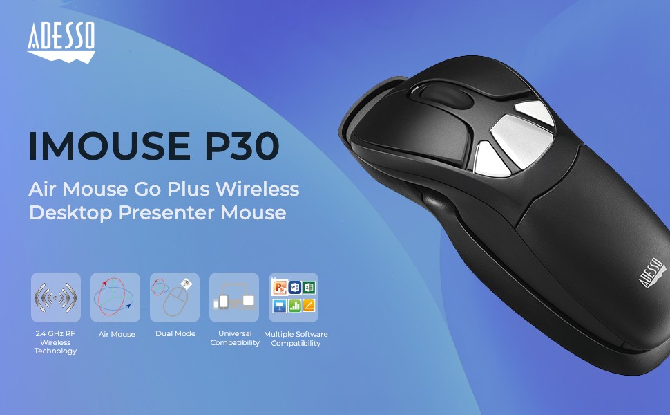 The iMouse P30 is a 2-in-1 wireless presenter mouse where with a simple switch, it instantly transforms from a wireless desktop mouse to a wireless air mouse presenter.
