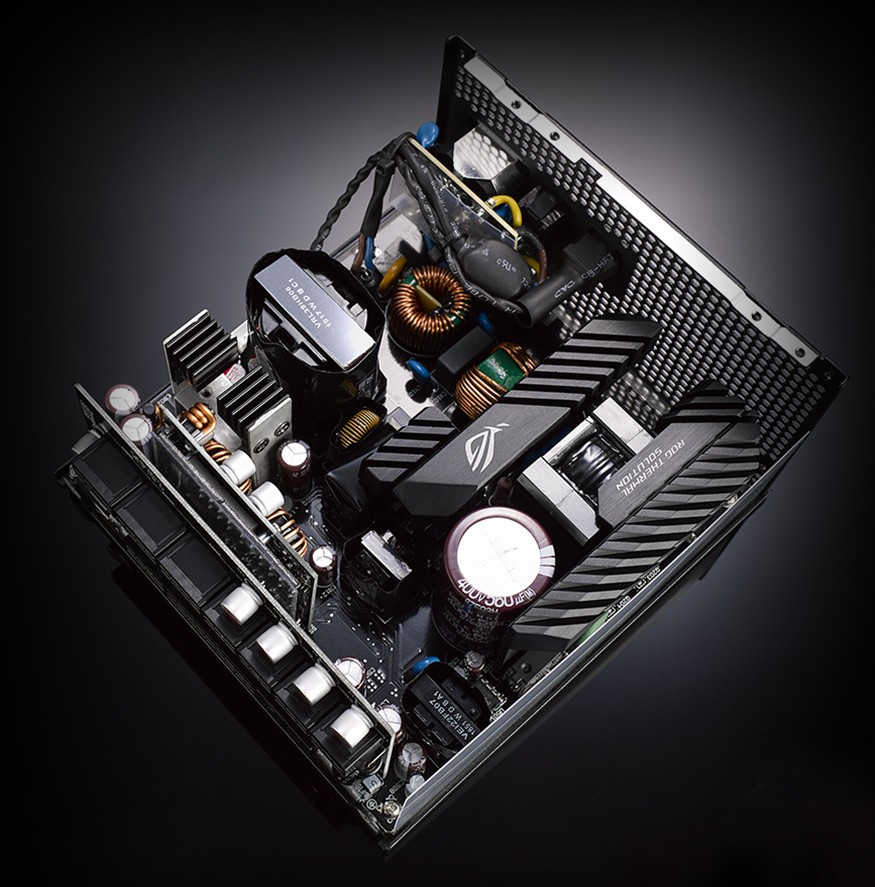 The integrated ROG heatsinks have 2x more volume than traditional designs, resulting in significantly lower temperatures inside Strix PSUs. This extends the lifespan of components and allows 0dB operation for a longer duration than standard designs. The heatsinks are so effective that fan noise stays whisper quiet, even under full load.