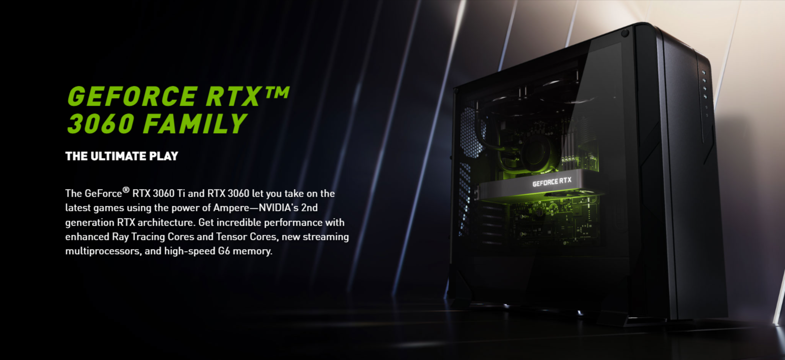 The GeForce RTX™ 3060 lets you take on the latest games using the power of Ampere—NVIDIA's 2 nd generation RTX architecture. Get incredible performance with enhanced Ray Tracing Cores and Tensor Cores, new streaming multiprocessors, and high-speed G6 memory.