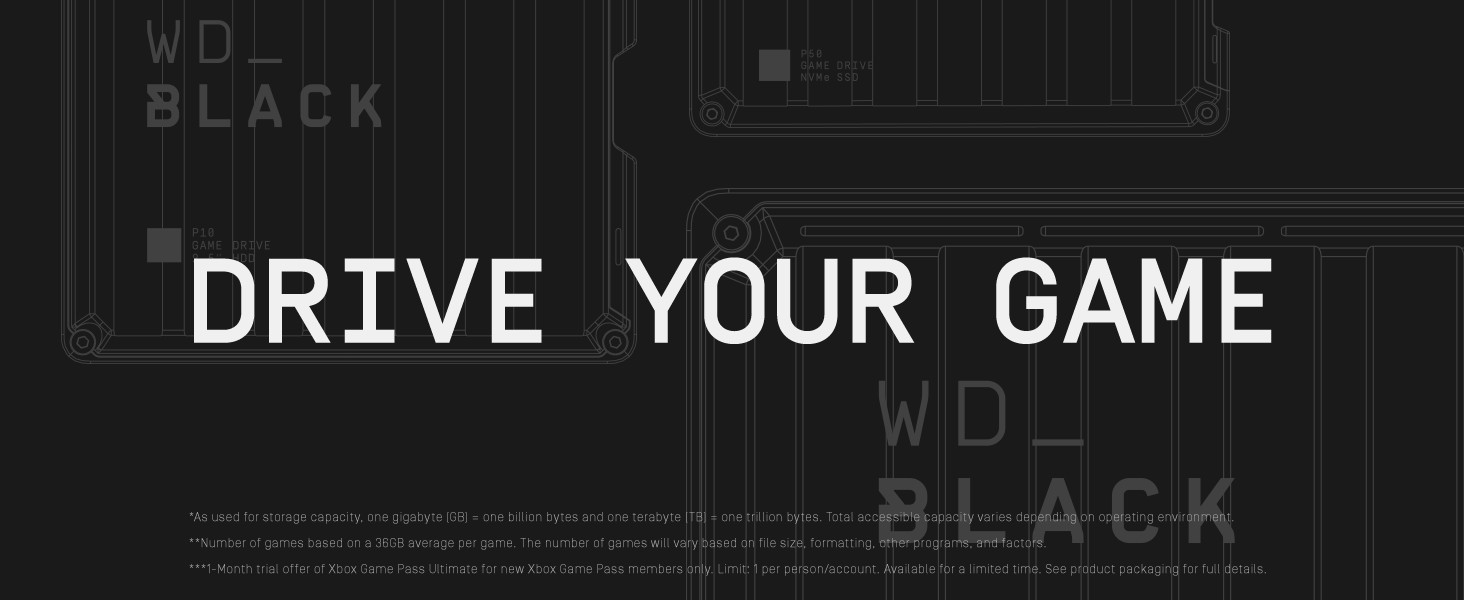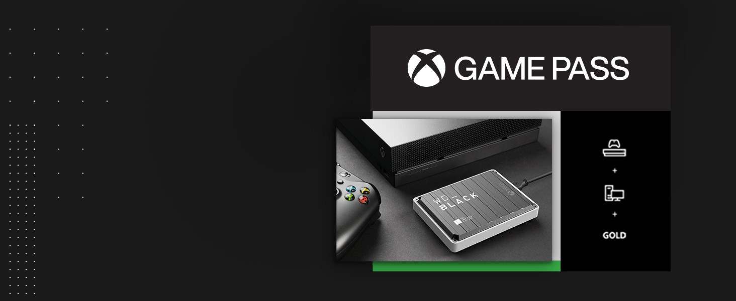 The WD_BLACK P10 Game Drive for Xbox is a portable HDD that comes in capacities up to 5TB* to save up to 125 games**. Comes with up to 1-Month membership of Xbox Game Pass Ultimate which includes Xbox Live Gold & access to 100+ Xbox & PC games.
