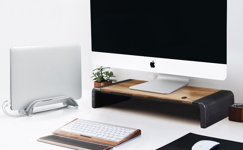 We started by raising the monitor to enhance ergonomics while offering extra USB ports with a monitor stand, so you do not need to be stranded with cables. An extra foldable rack gives space to rest your mobile phone or tablet.