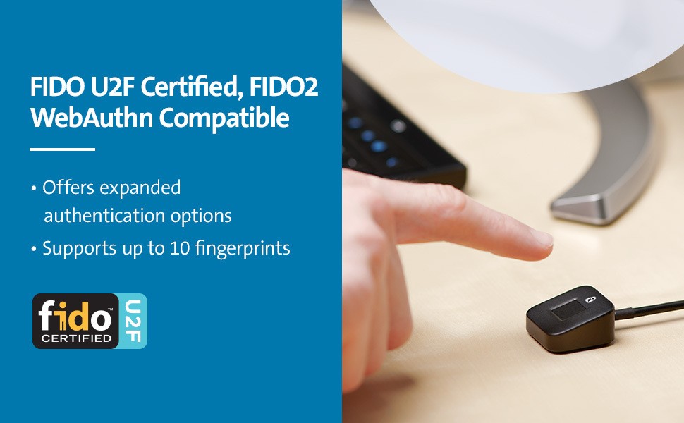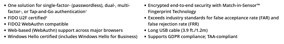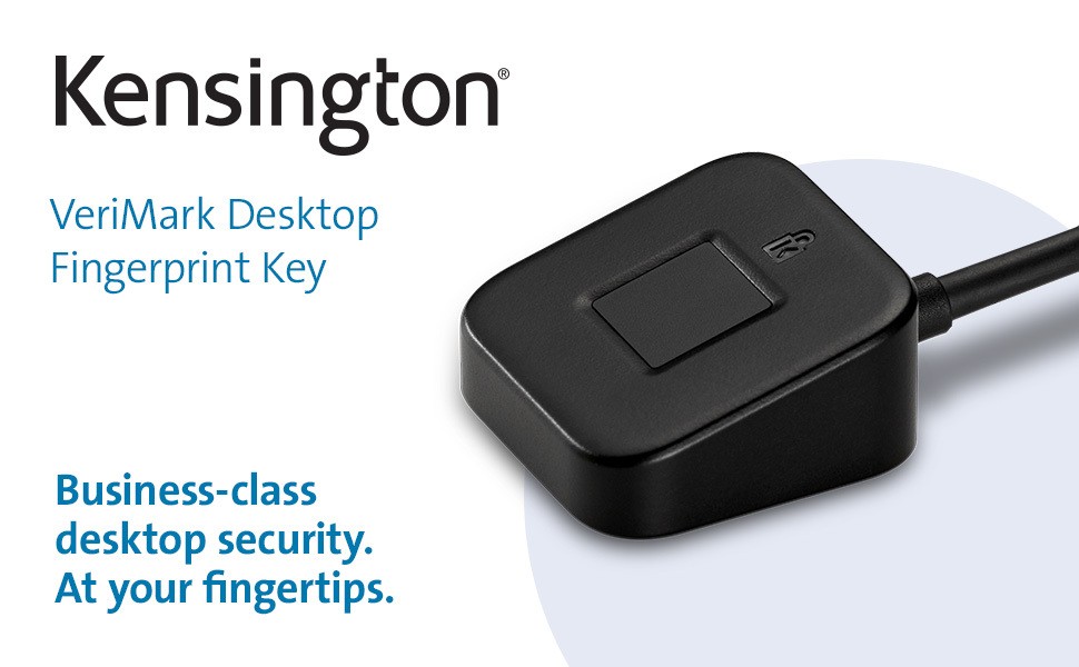 VeriMark™ Desktop Fingerprint Key With support for the latest in biometric technology, the VeriMark™ Desktop Fingerprint Key puts business-class desktop security at your fingertips. Ideal for enterprise PC deployment, the VeriMark™ Desktop Fingerprint Key is FIDO U2F Certified, and FIDO2 WebAuthn compatible. Windows Hello certified (includes Windows Hello for Business) for seamless integration. Also compatible with additional Microsoft services including Office365, Azure, Outlook, and many more. It’s a secure, reliable, and simple solution for singlefactor (passwordless), dual, multi-factor, and Tap-and-Go1 for FIDO U2F services, offering web-based (WebAuthn) support across major browsers. Encrypted end-to-end security with Match-in-Sensor™ Fingerprint Technology exceeds industry standards for false acceptance rate (FAR) and false rejection rate (FRR). Includes a long (3.9 ft./1.2m) USB cable for flexible placement. Supports GDPR compliance and is TAA-compliant.