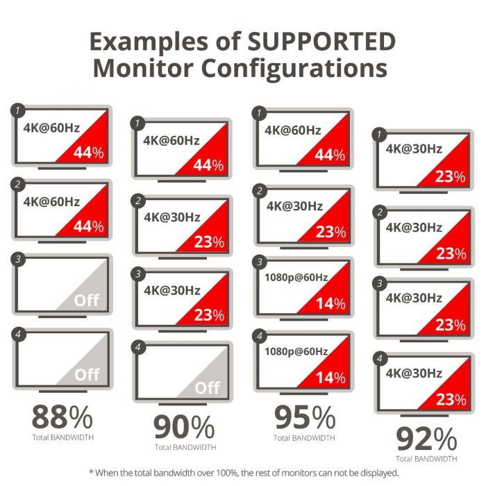 - Total Bandwidth 32.4Gbps (max): Supports one UHD 8K (7680 x 4320)@30Hz display, two 4K@60Hz displays, three or four 4K (3840x2160)@30Hz or less display. Other resolution combinations which are less than or equal to 4K@30Hz will work also. For example, four 2K, four 1080p, 4K+2K+1080p+1080p etc.