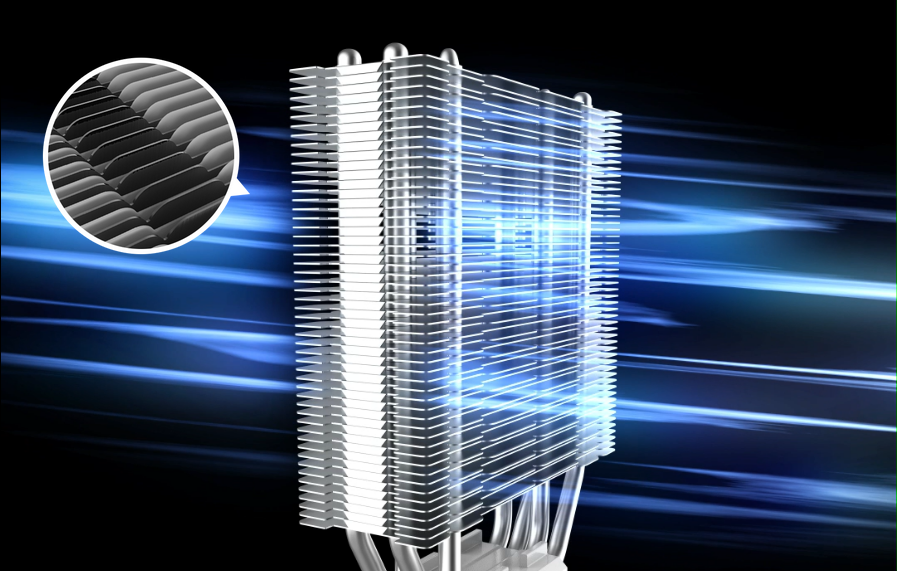 The fin is designed with an asymmetric structure that allows larger air intakethrough the fins. This design lowers the air turbulence and straightens out the airflow making it easier todisperse heat from the fins, delivering superb cooling performance.