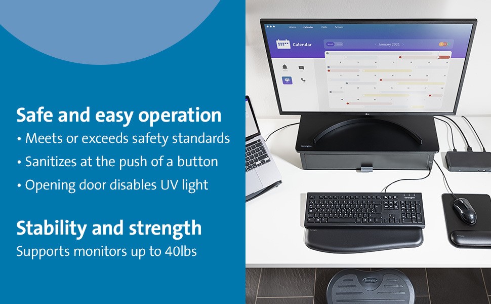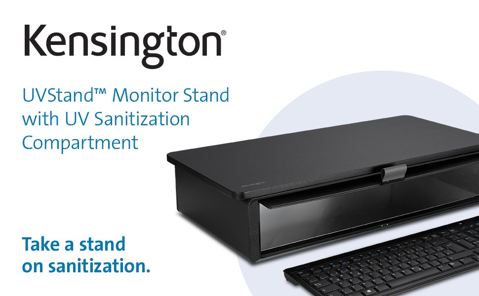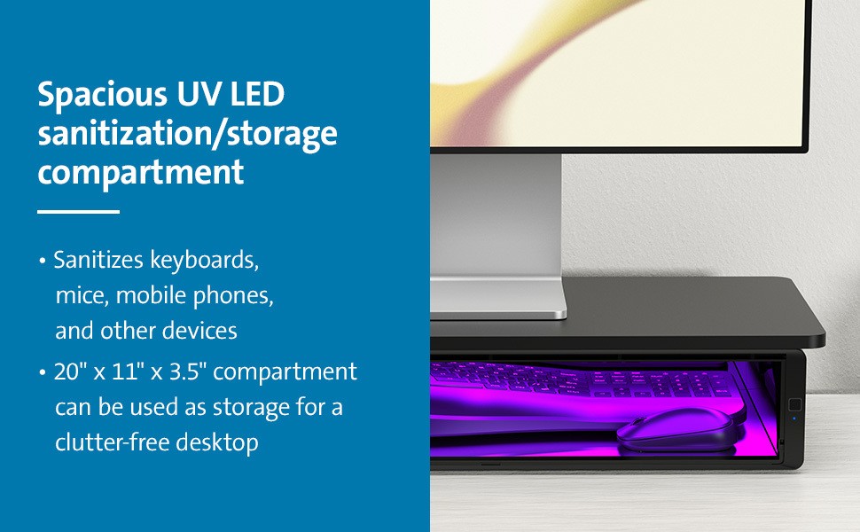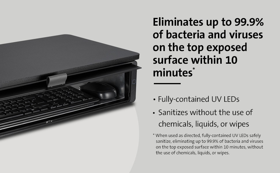 When used as directed, the UVStand⢠Monitor Stand with UV Sanitization Compartment safely, easily, and efficiently helps to sanitize keyboards, mice, trackballs, mobile phones, and other devices, while promoting healthy posture and optimal comfort. The spacious sanitization compartment accepts most full-sized keyboards in addition to other devices, and can be used to store desktop items when not sanitizing, for a more clutter-free desktop.