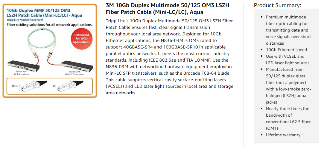 The N836-03M is manufactured using top-quality materials. It has 50/125 duplex (zipcord) fiber made from glass instead of a polymer, a low-smoke zero-halogen (LSZH) jacket and sturdy Mini-LC/LC connectors. The low-smoke zero-halogen jacket limits the amount of toxic smoke emitted in case of combustion and is perfect for poorly ventilated areas. The jacket is aqua to identify the N836-03M as a 10Gb cable.