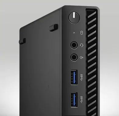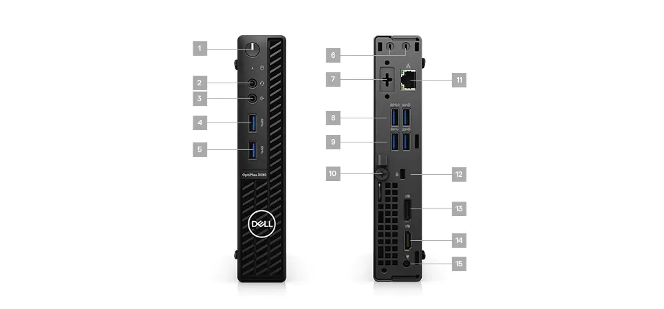 1. Power Button | 2. Universal Audio Jack | 3. Line-out | 4. USB 3.2 Gen 1 Type-A port | 5. USB 3.2 Gen 1 Type-A port | 6. Knock-out Slots for Wireless Antenna | 7. Optional Video Port: Serial/DP 1.4/HDMI 2.0b/VGA) | 8. USB 2.0 Ports (2) (1 with Smart Power on) | 9. USB 3.2 Gen 1 Type-A ports (rear) (2) | 10. Thumbscrew | 11. RJ-45 port 10/100/1000 Mbps | 12. K-lock Slot | 13. DisplayPort | 14. HDMI Port | 15. Power Connection