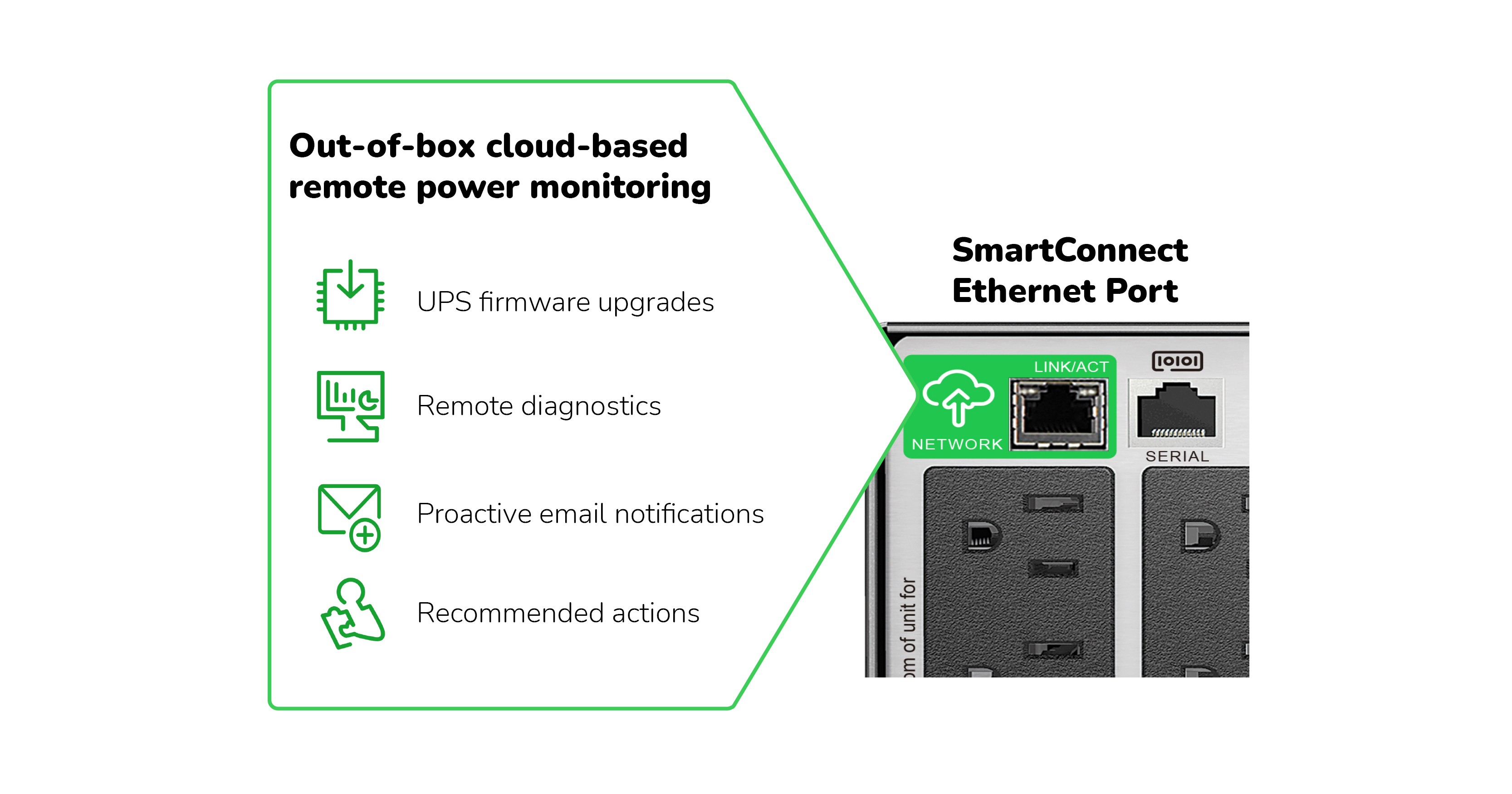 Built-in secure cloud monitoring with the EcoStruxure Ready Smart-UPS Ethernet Port. Network manageable via serial, USB or EcoStruxure™ Ready Smart Connect Ethernet Port. Includes