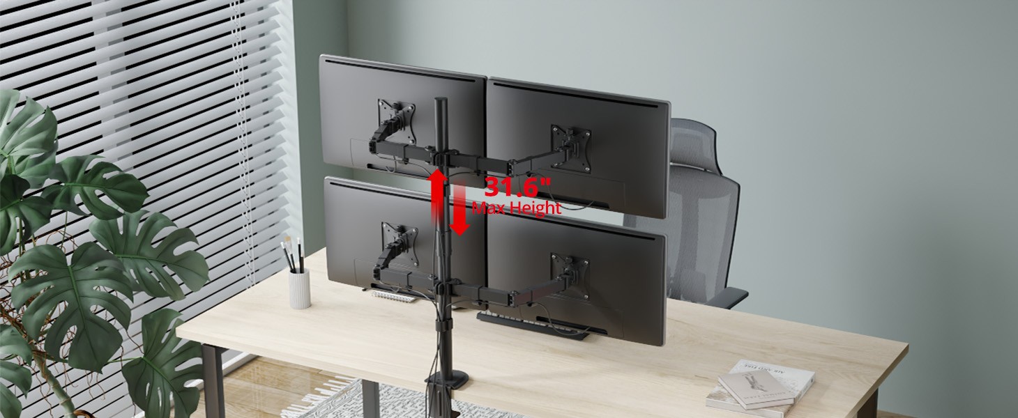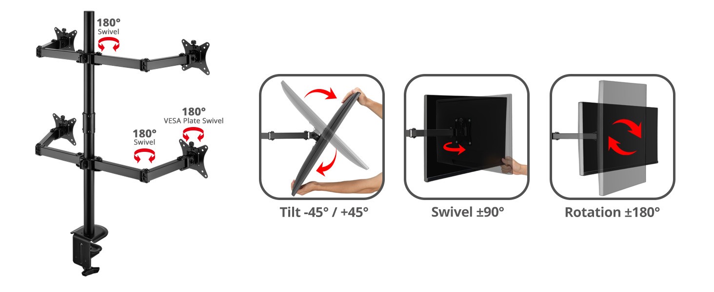 Quad monitor full-motion adjustment desk mount – independently tilt, swivel, rotate and extend four monitors, Fits 13" to 32" monitors, Max Load 19.8 lbs(each), VESA Plate 75x75mm/100x100mm, Cable Management, C-Clamp, Grommet