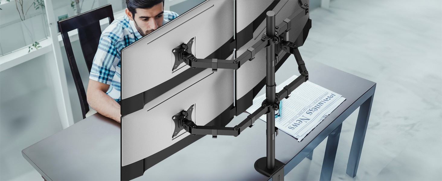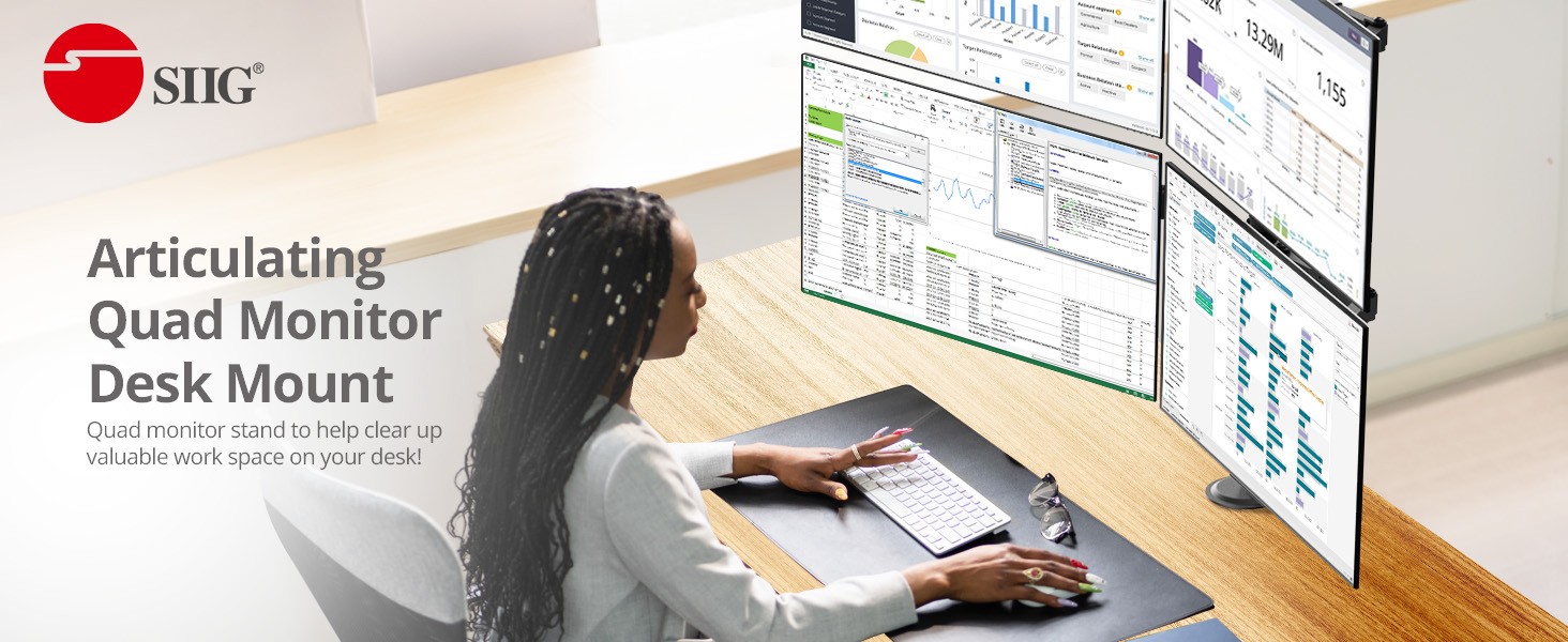 SIIG's Articulating Quad Monitor Desk Mount - 13" to 32" designed to support four monitors ranging from 13" to 32" in size, is ideal for any environment requiring high productivity and multi-screen setups