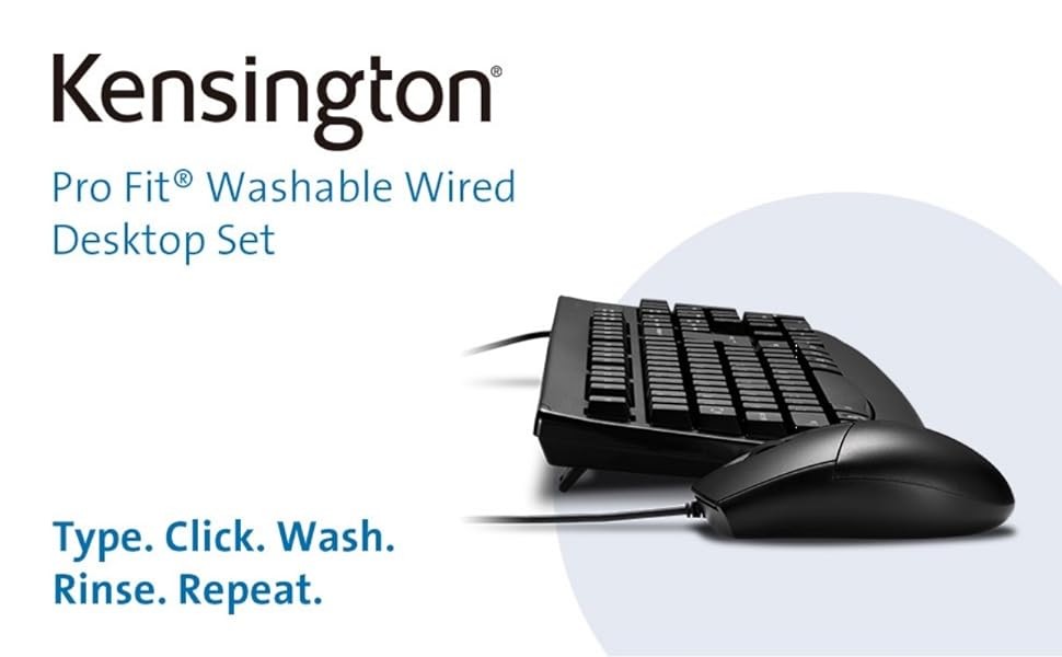 The Pro Fit Wired Washable Keyboard and Mouse Set, with its waterproof, easy-clean, rugged design, is ideal for maintaining a hygienic surface and cleaning up drips and spills, without sacrificing performance*. Full-size, six row, 104-key keyboard includes a numeric keypad, and laser-etched keys feature highly readable letters that won’t wear off. Ambidextrous, contoured mouse with three-button scroll wheel provides a comfortable experience for left- and right-handed users. High-definition 1600 DPI optical sensor tracks the mouse’s movements with smooth accuracy for optimal performance and productivity.
