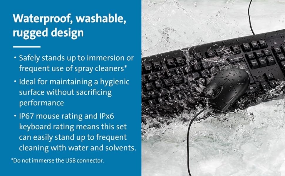 ● Completely washable, rugged design resists spills and makes cleaning and disinfecting easy* (IP67 mouse, IPx6 keyboard)