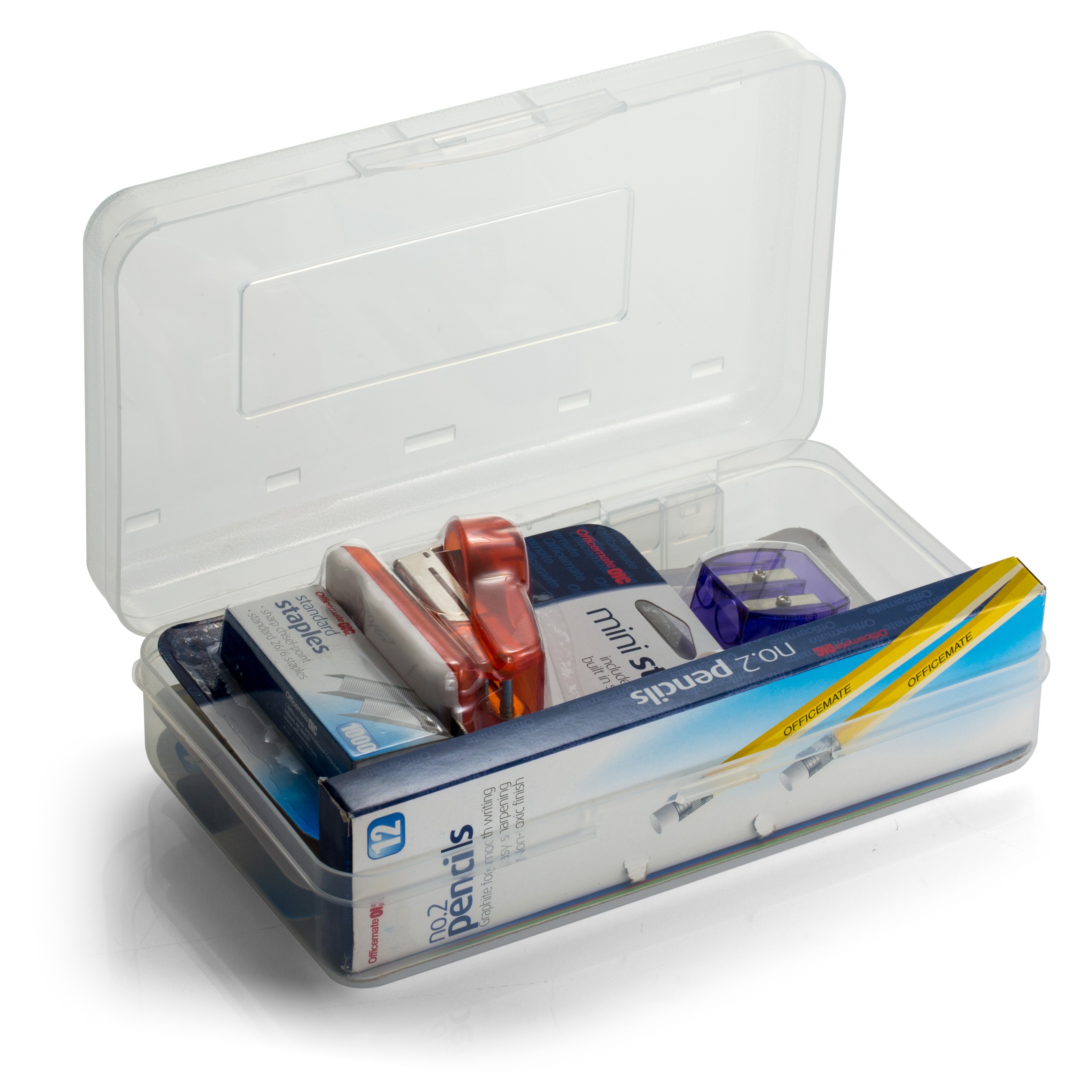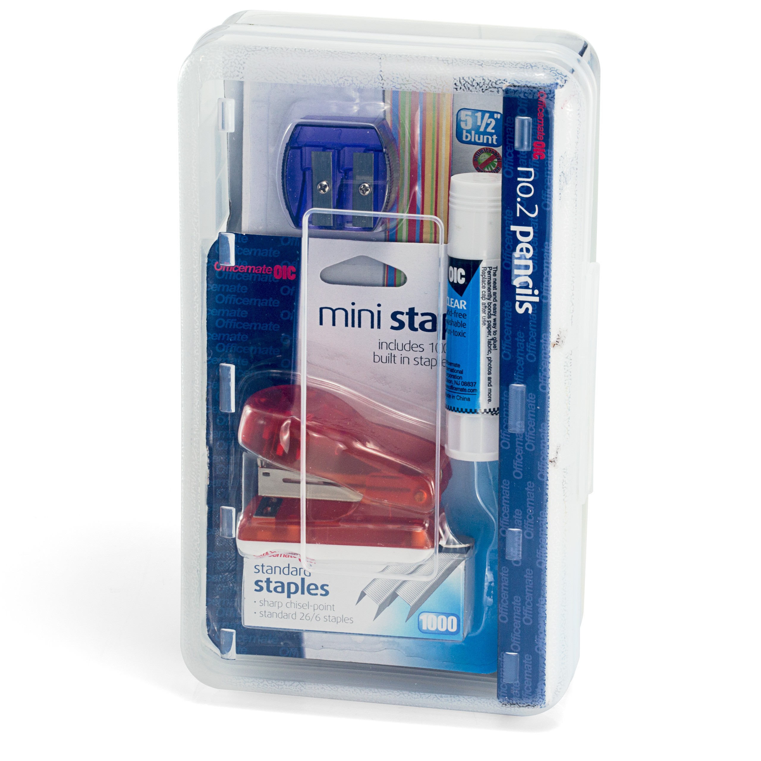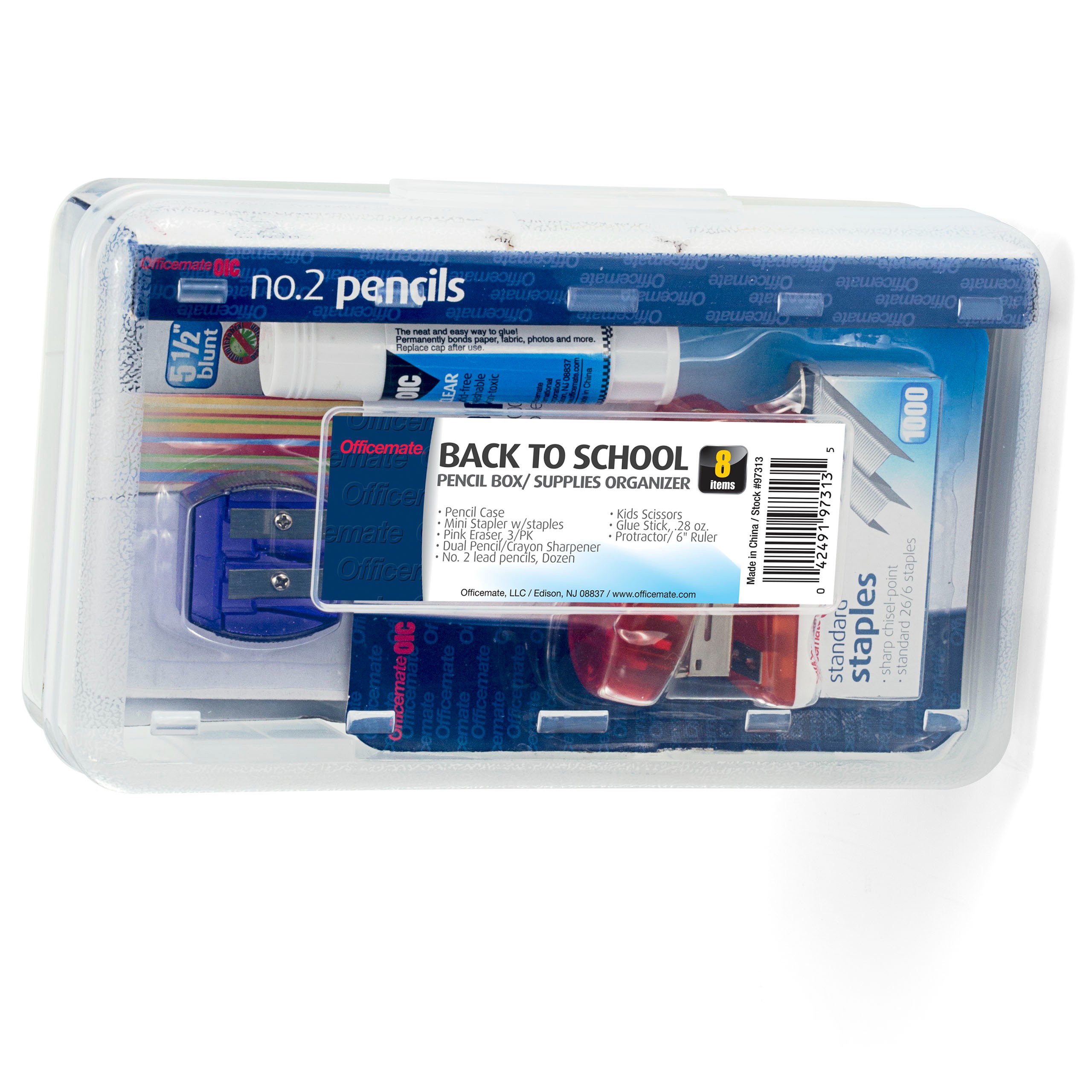 Contents included: 1 – 66532 Pencil Box, Clear. Dimension: 8.3”L x 4.8”W x 2.4”H, 2 – 66520 No. 2 Lead Pencils, Dozen, 3 – 30202 Protractor with 6" Ruler, Ass’t colors, 4 – 94131 5" Blunt Stainless Steel Scissors, Assorted Colors