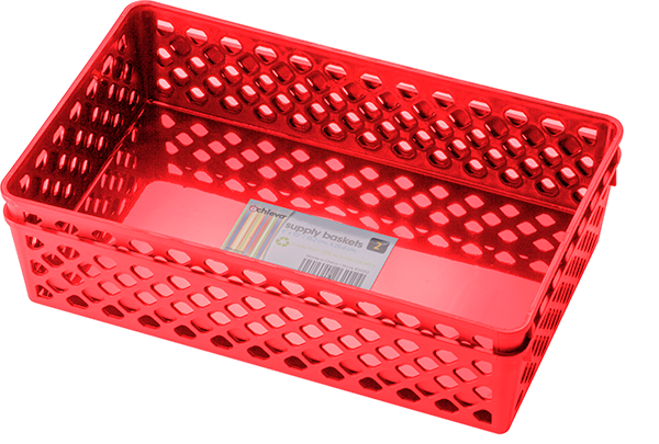 Large supply basket ideal for storing supplies, crafts, cosmetics, and more. Each basket measures 10 5/8” width x 6 1/8” depth x 2 3/8” height. Pack of 3. Comes in vibrant assorted colors: red, blue, and green.