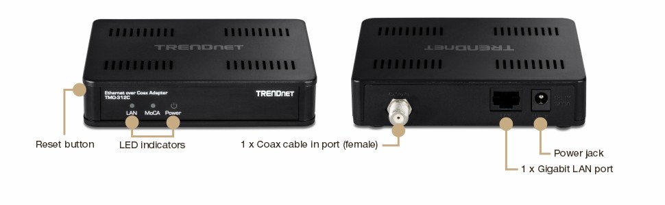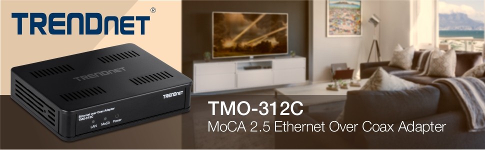 TRENDnet’s MoCA ® 2.5 Ethernet Over Coax Adapter, model TMO-312C, uses your existing coaxial cables to extend a high-speed building-wide Triple Play network throughout your home or office. These compact MoCA adapters are designed to support MoCA 2.5 deployment for digital TV, High-speed internet, and VoIP single-access subscription service offerings. Compliant with Multimedia over Coax Alliance (MoCA 2.5) standards with improved packet error rate technology that delivers consistent voice and video bandwidth with lowered latency.